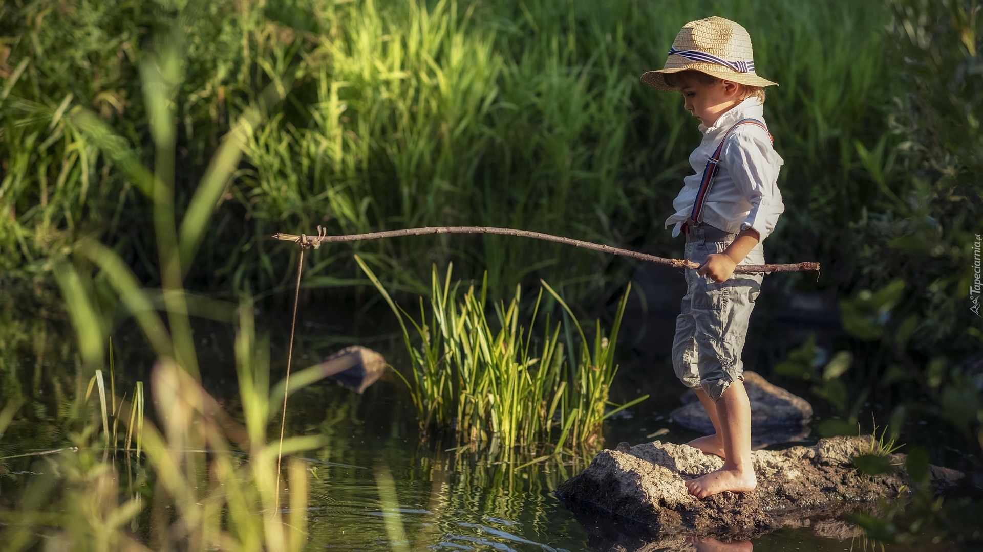 Edytor tapety: Chłopiec z wędką nad jeziorem