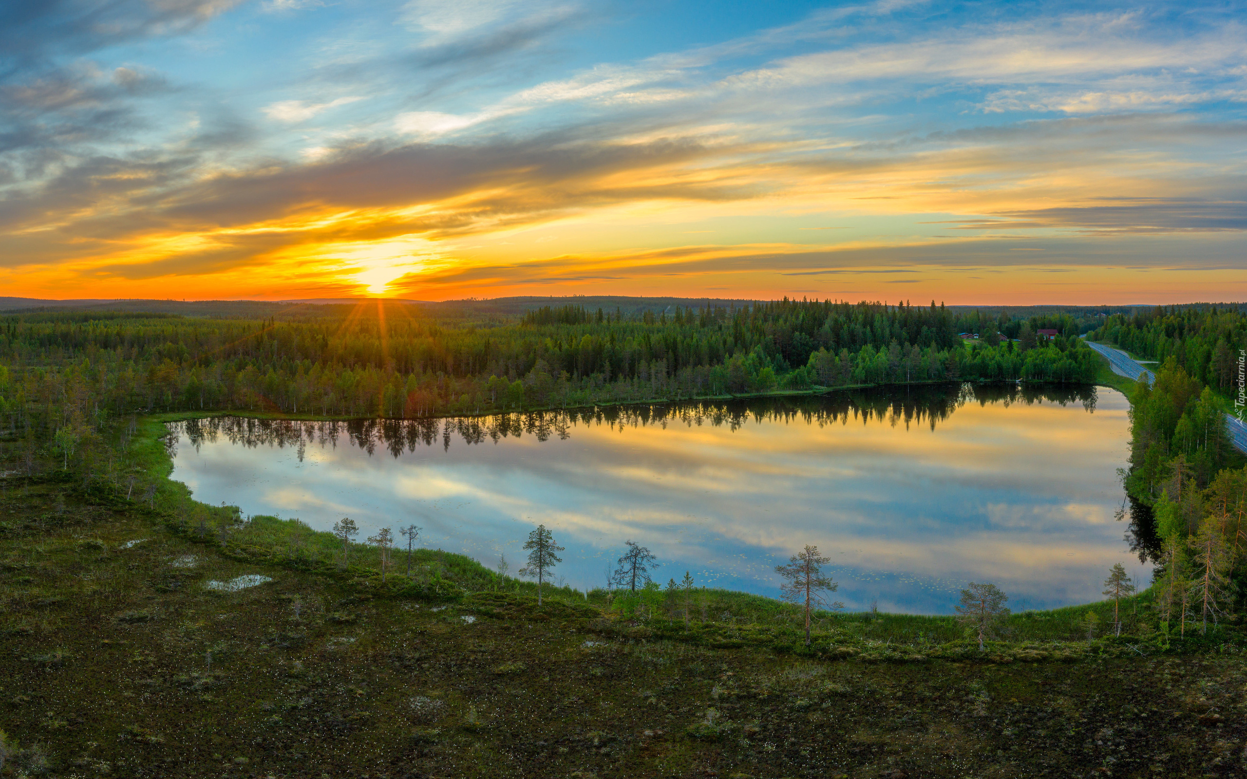 Edytor tapety: Zachód słońca nad jeziorem i lasami