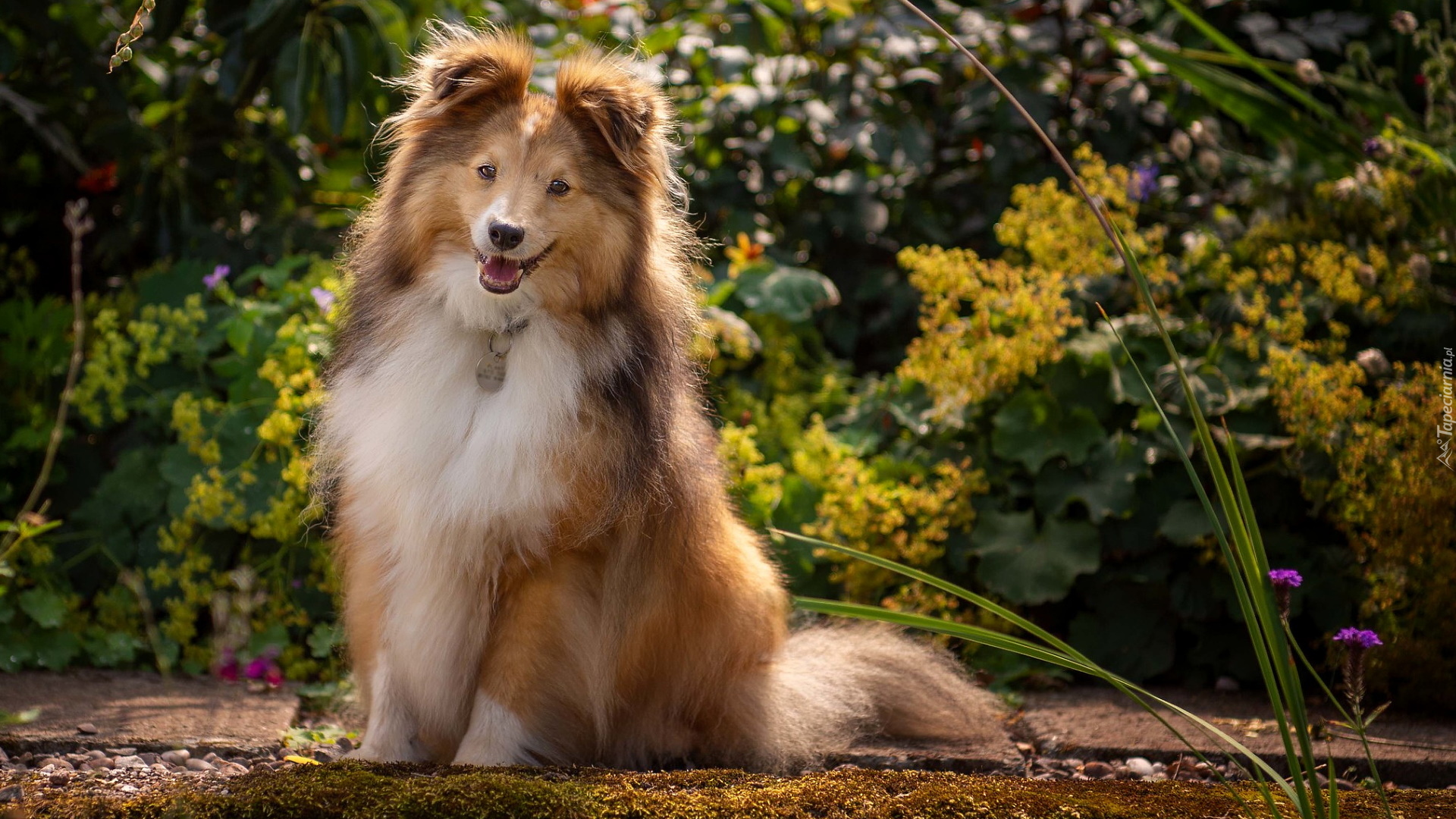 Edytor tapety: Owczarek szetlandzki siedzący obok kwiatów w ogrodzie