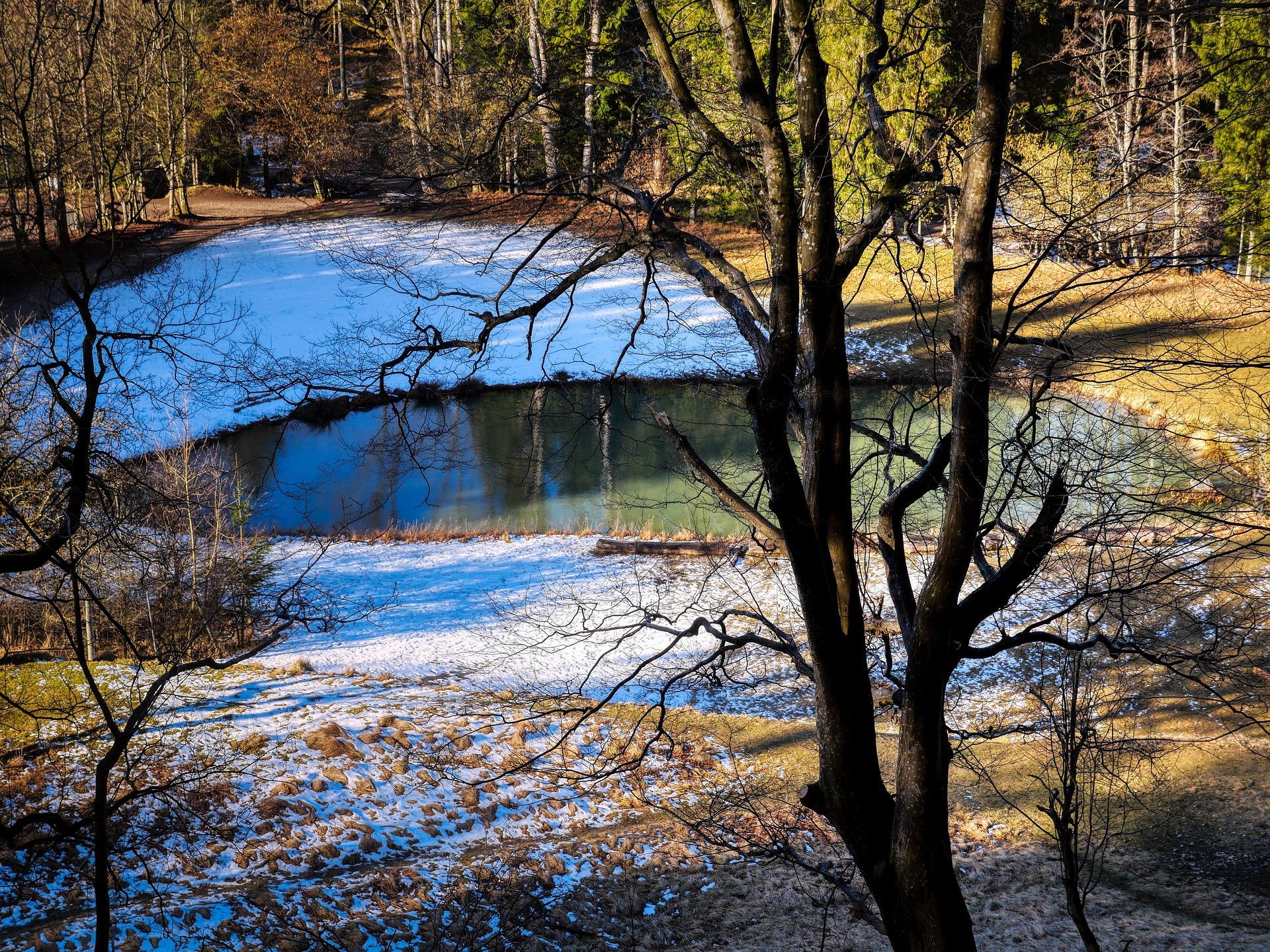 Edytor tapety: Śnieg na brzegach stawu w jesiennym lesie