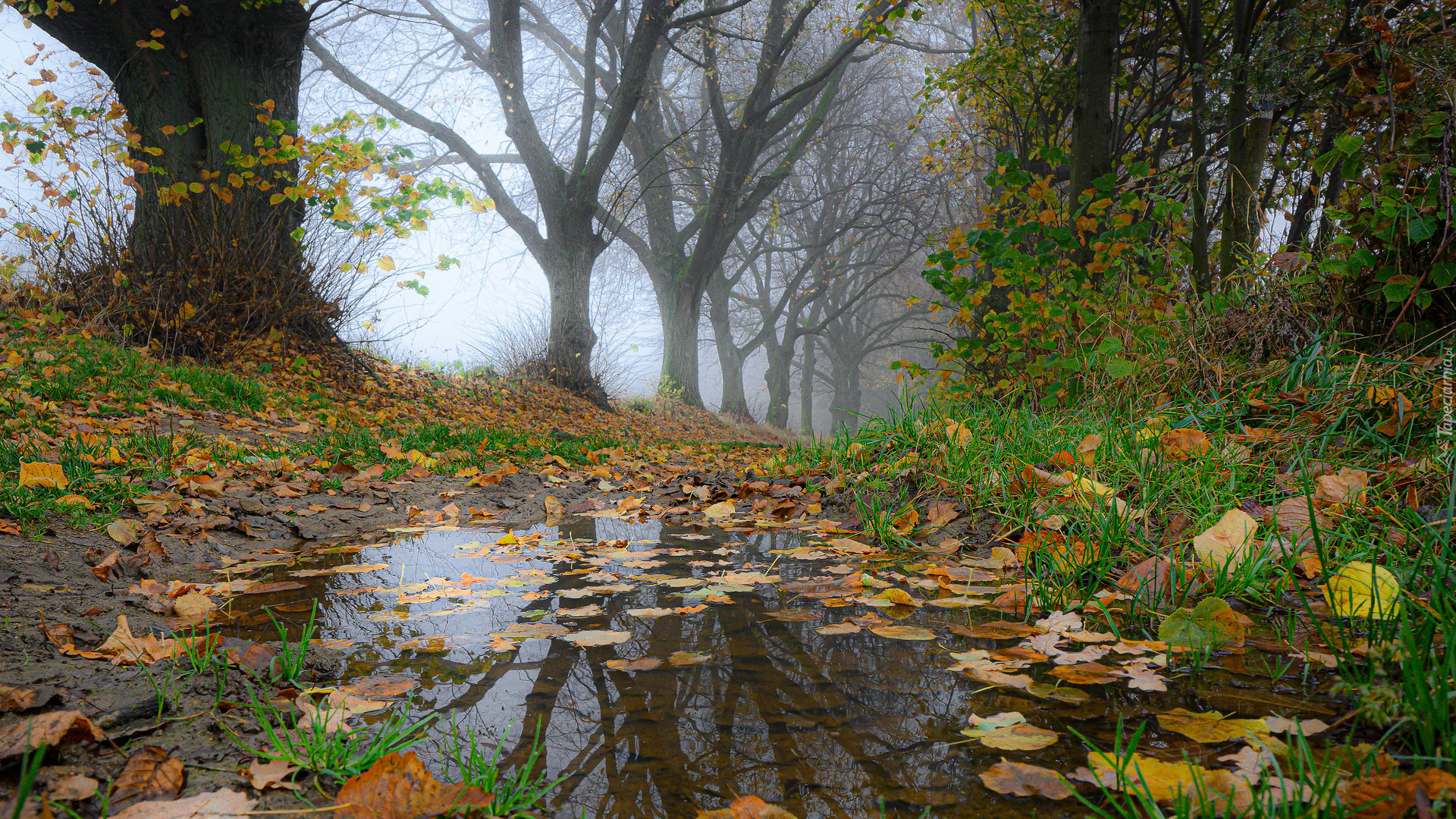 Edytor tapety: Kałuża z opadłymi liśćmi na drodze wśród drzew
