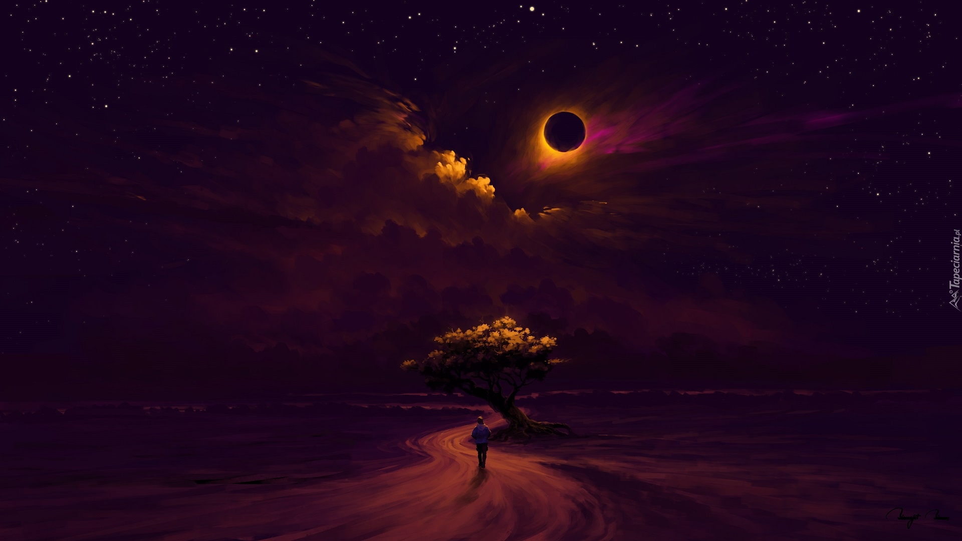 Edytor tapety: Drzewo przy drodze pod gwieździstym niebem