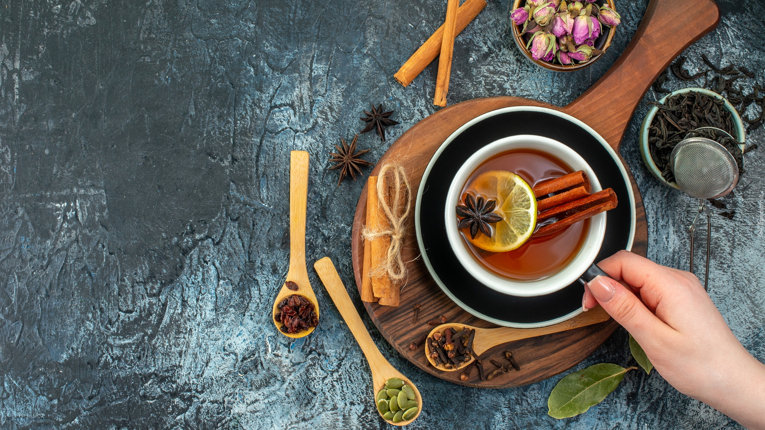 Edytor tapety: Filiżanka herbaty z cytryną i cynamonem na desce