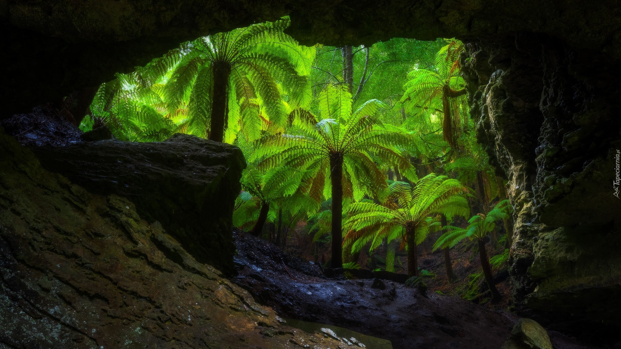 Edytor tapety: Widok z jaskini Trowutta Arch na las palmowy