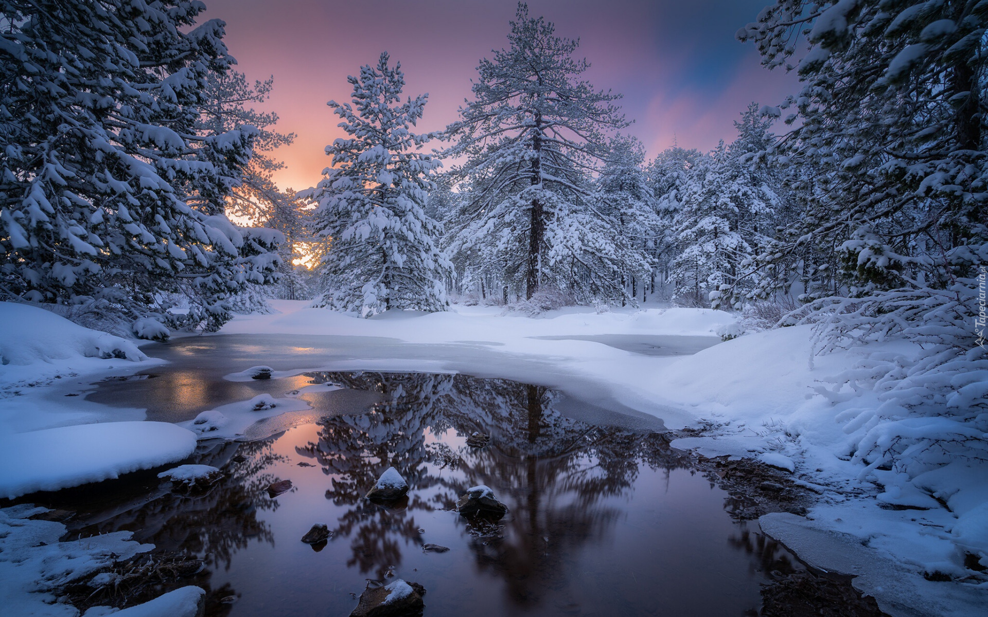 Edytor tapety: Ośnieżone drzewa i rzeka o poranku