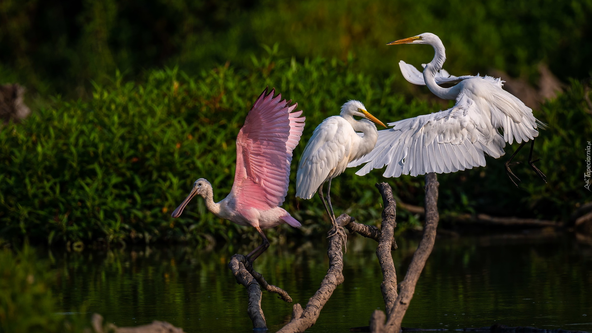 Edytor tapety: Warzęcha różowa i czaple białe