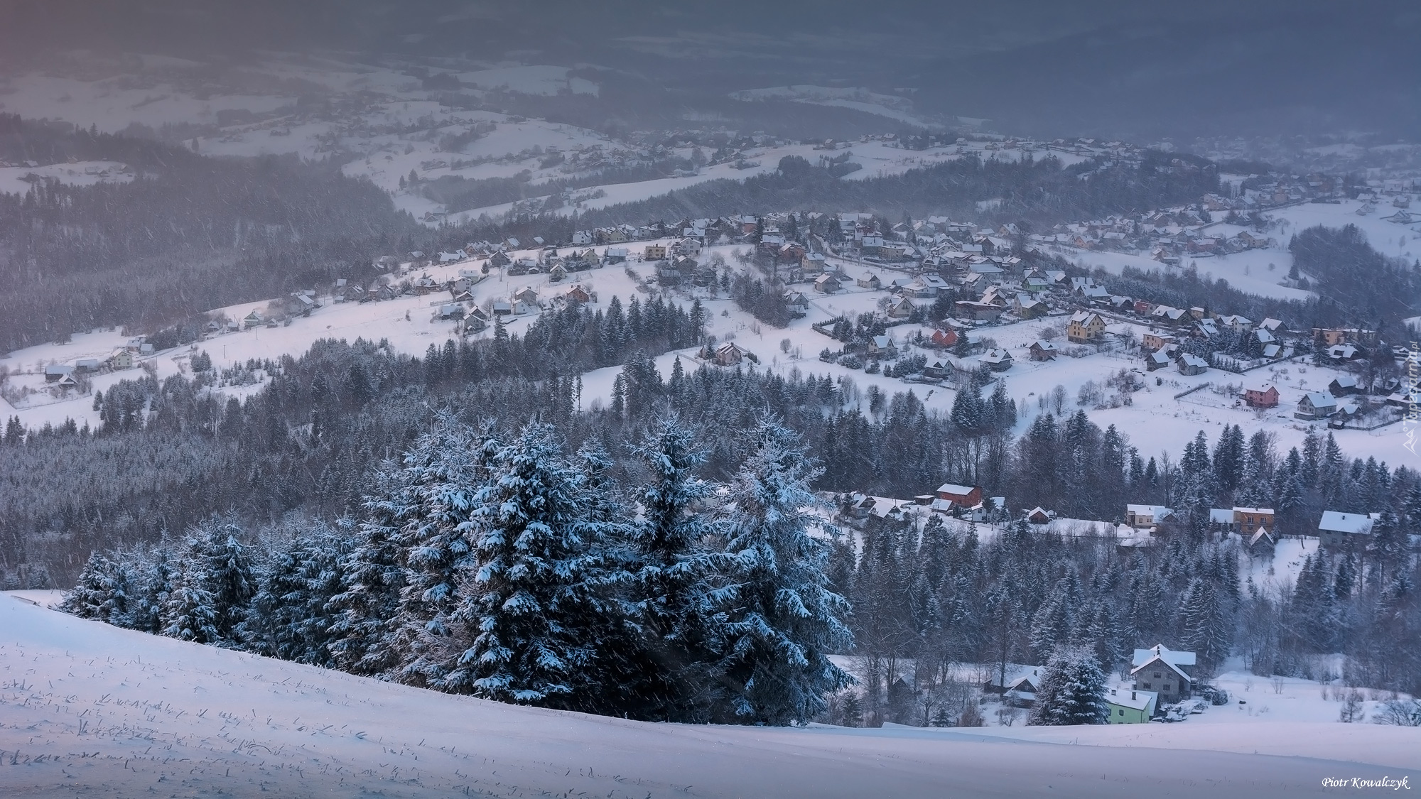Edytor tapety: Drzewa i domy w zimowej dolinie