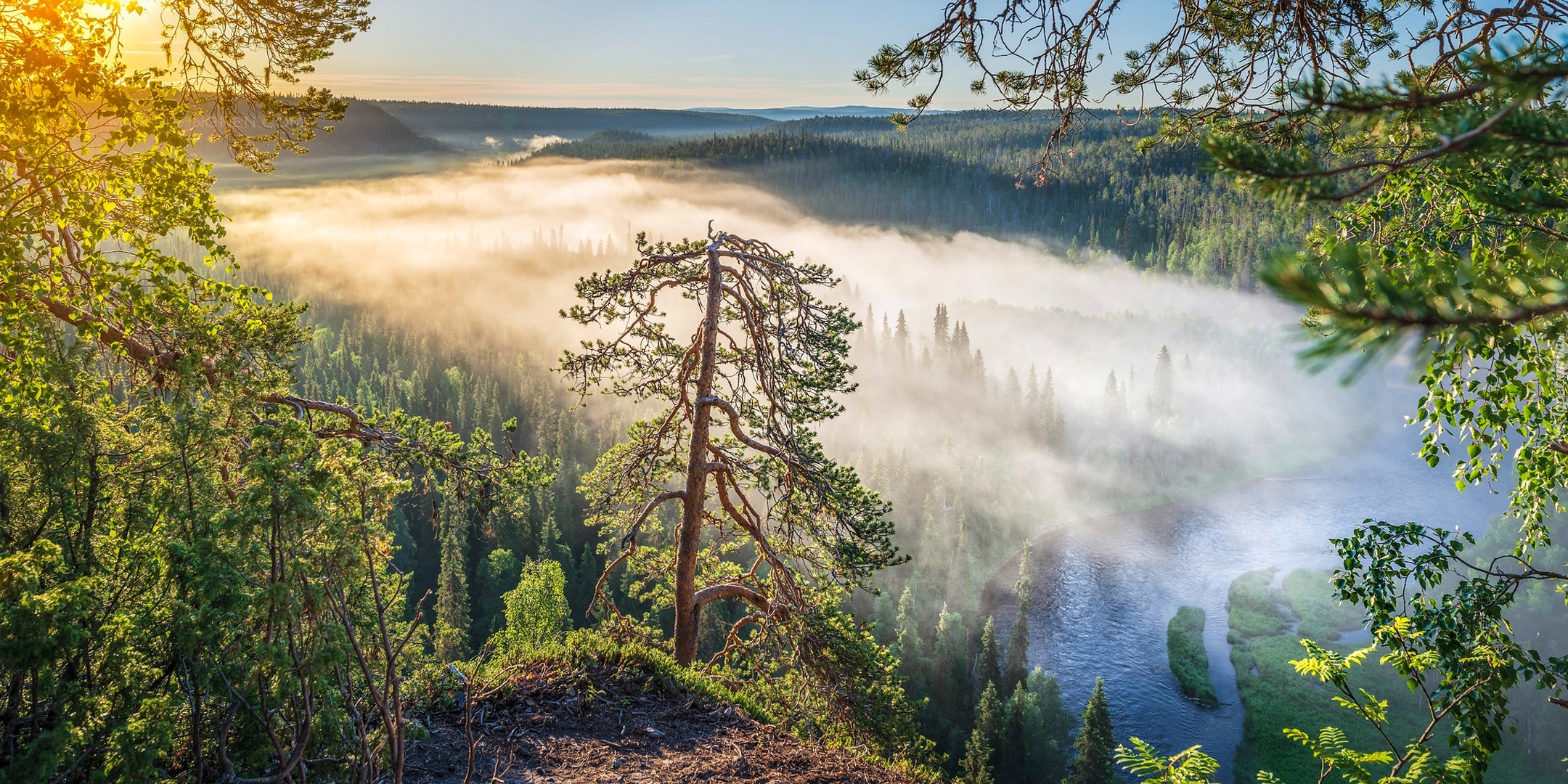 Edytor tapety: Widok zza drzew na zamgloną rzekę