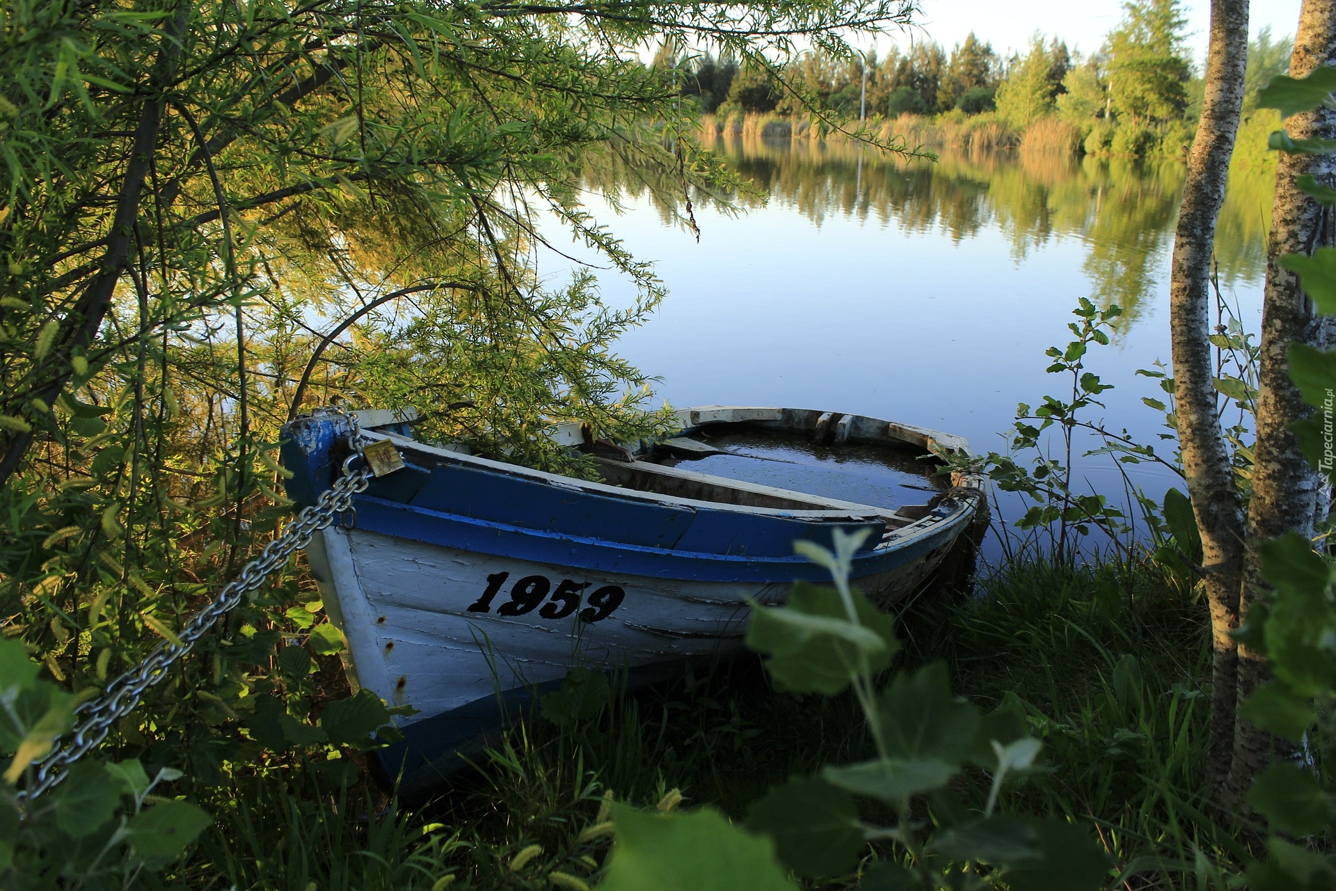 Edytor tapety: Woda w łódce na brzegu jeziora