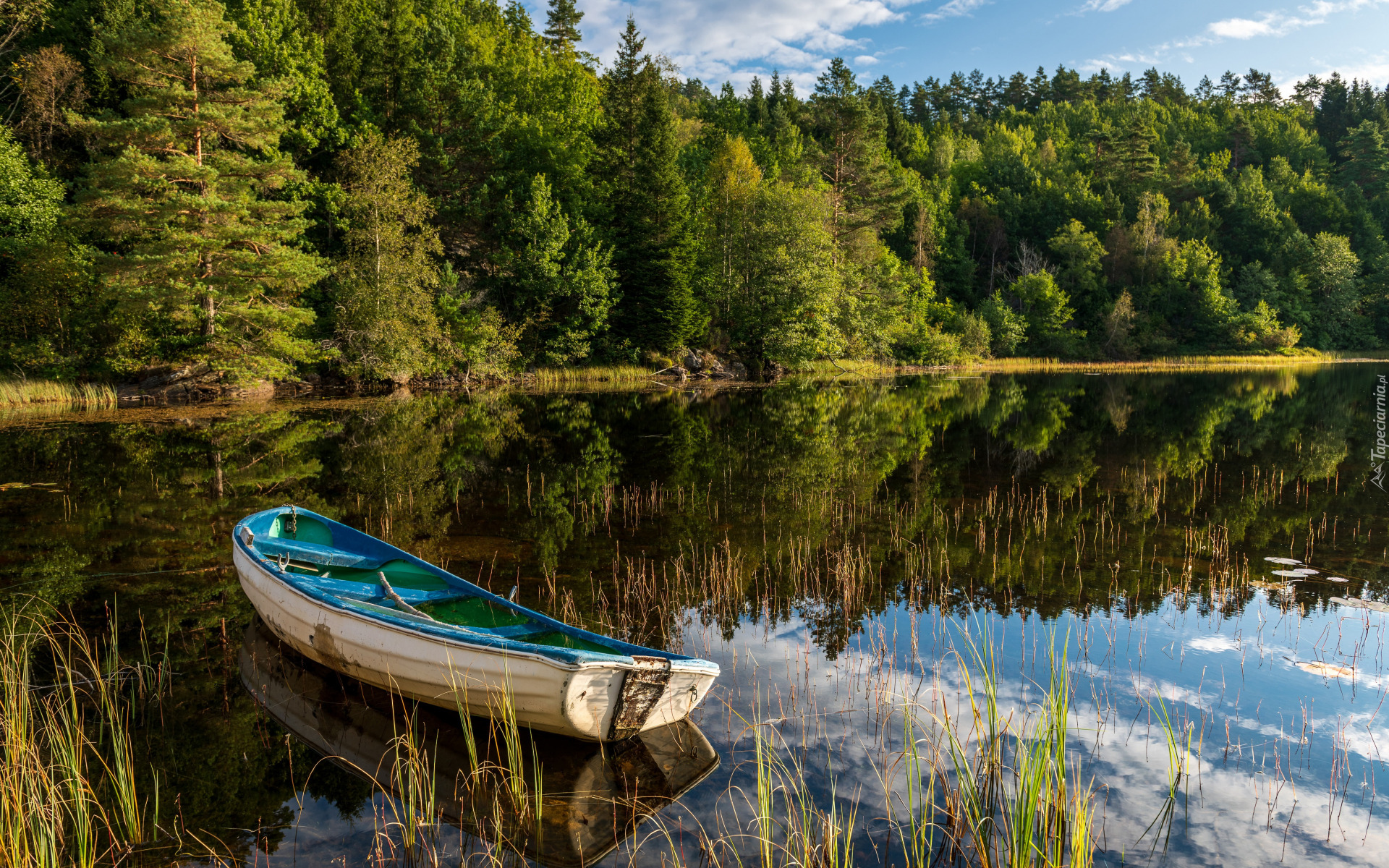Edytor tapety: Niebiesko-biała łódka na jeziorze
