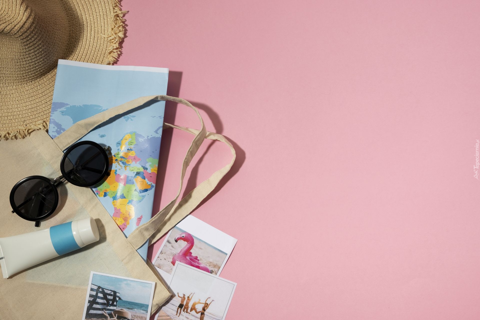 Edytor tapety: Słomiany kapelusz obok mapy i ciemnych okularów