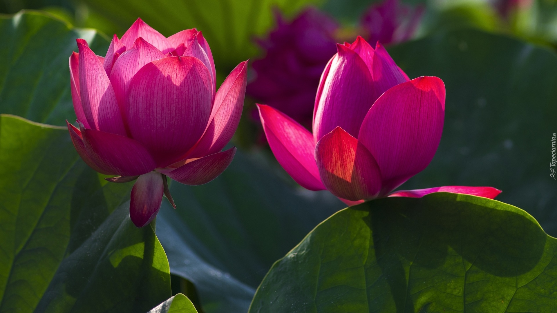 Edytor tapety: Dwa różowe kwiaty lotosu wśród zielonych liści