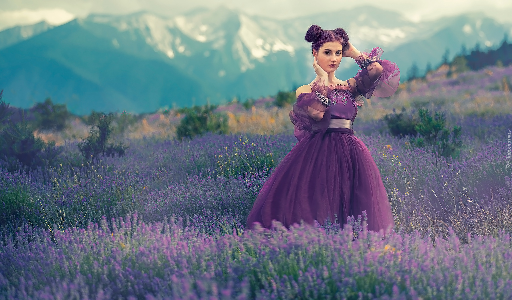 Edytor tapety: Kobieta w fioletowej sukni na polu lawendy