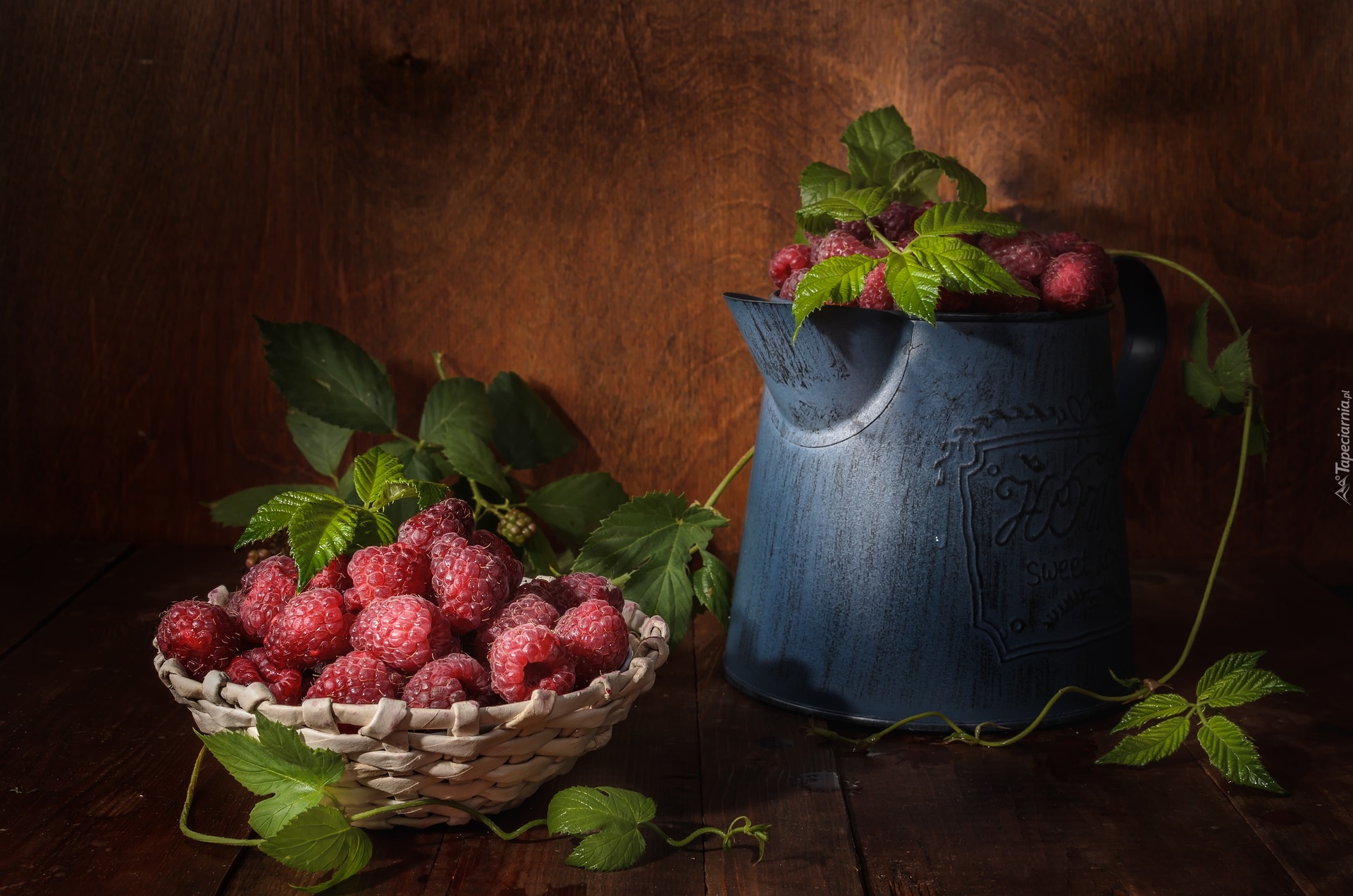 Edytor tapety: Maliny w koszyczku i dzbanku