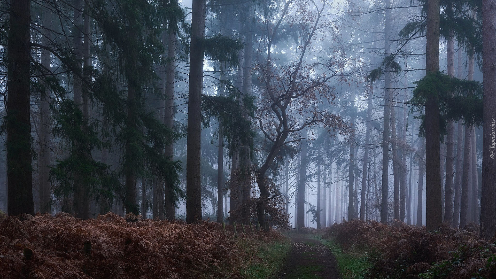 Edytor tapety: Pożółkłe paprocie przy drodze w zamglonym lesie