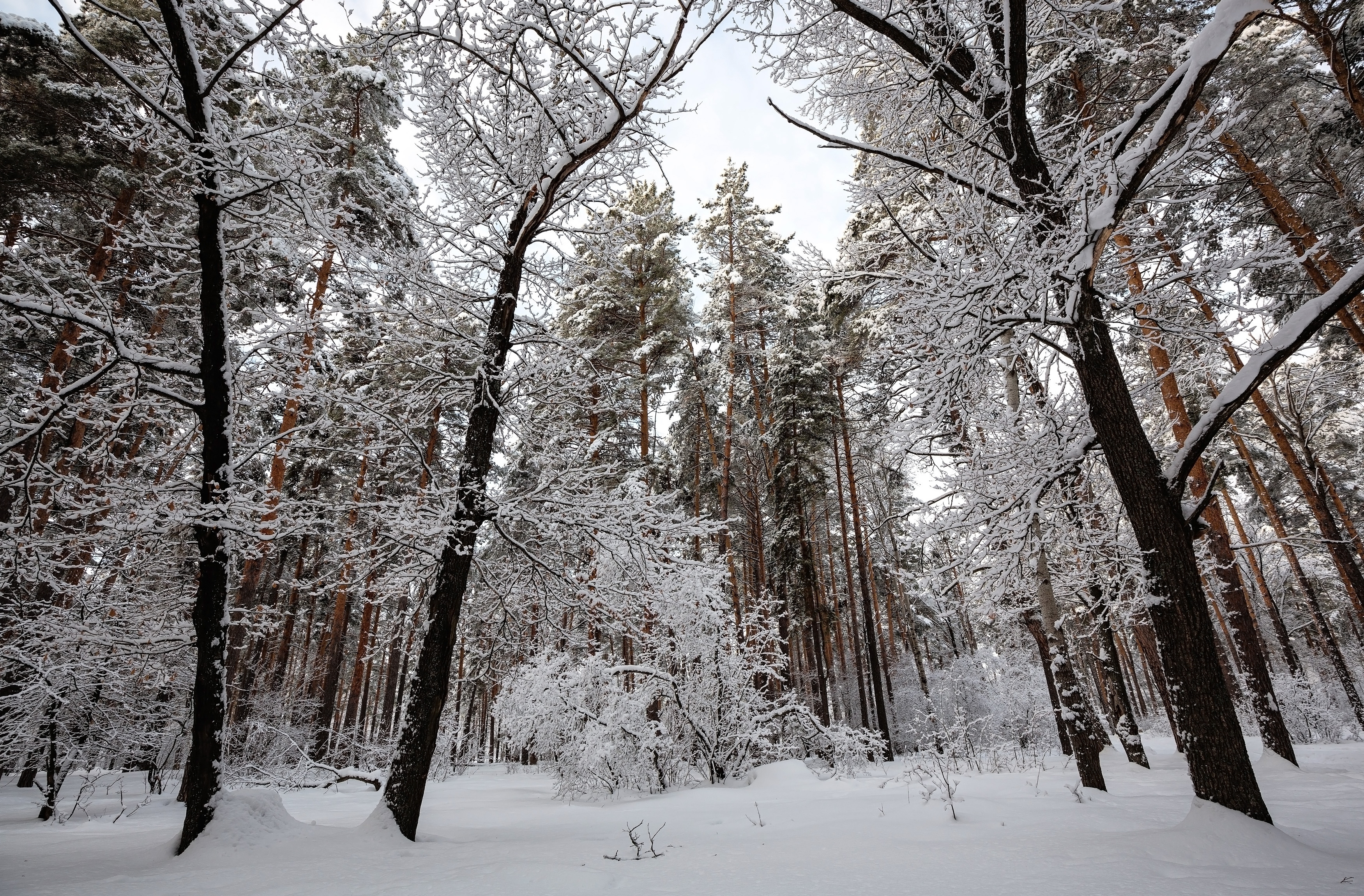 Edytor tapety: Wysokie ośnieżone drzewa w lesie