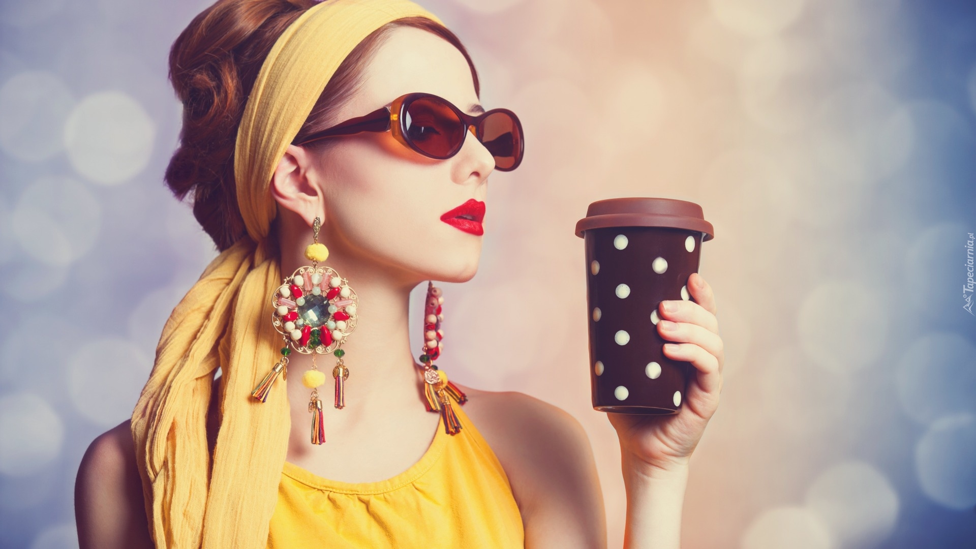 Edytor tapety: Kobieta w okularach z kubkiem kawy
