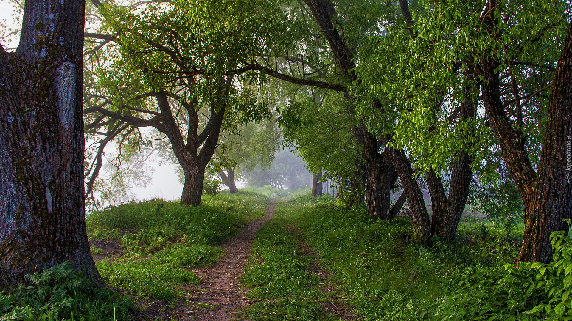 Edytor tapety: Zielone drzewa i trawa przy ścieżce