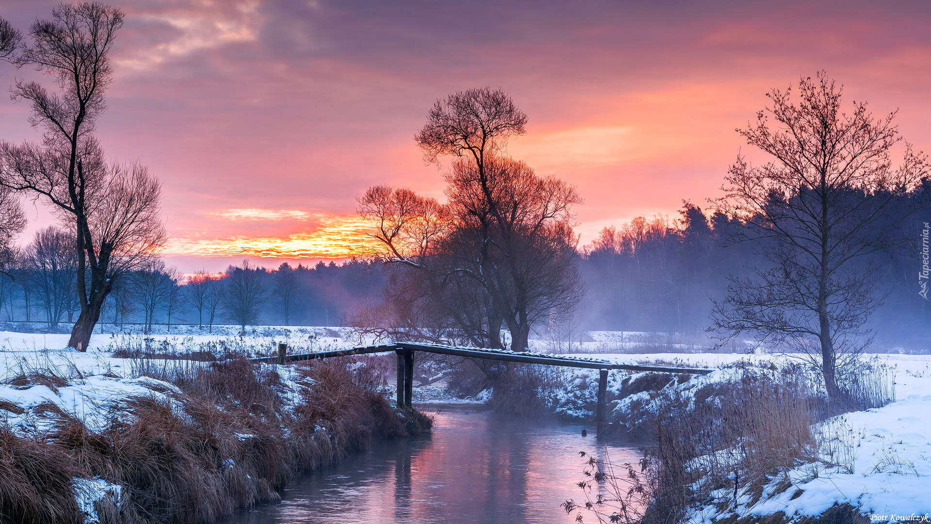 Edytor tapety: Drzewa i mostek nad rzeką zimową porą