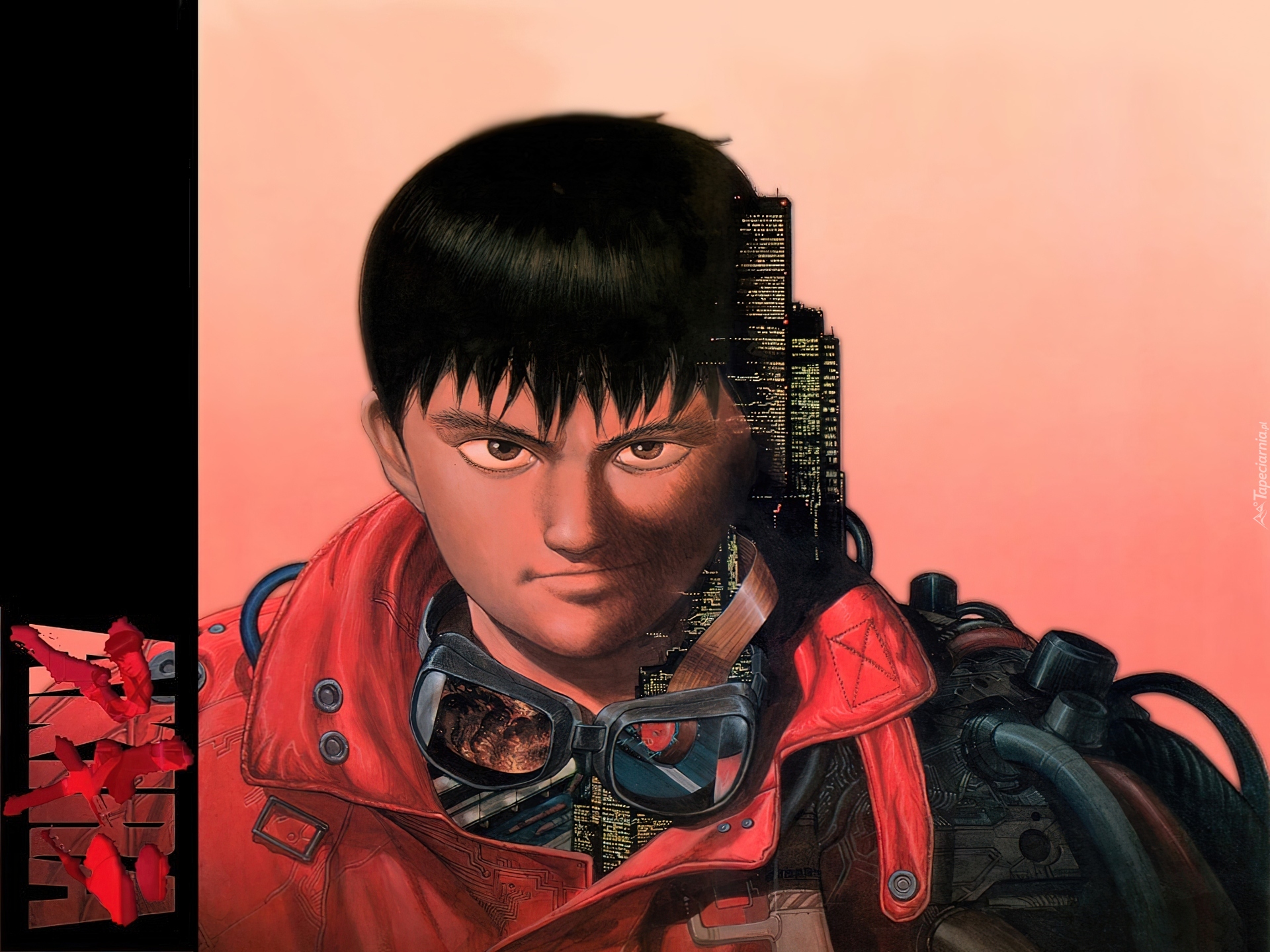 Edytor tapety: Akira, budynki, postać, gogle