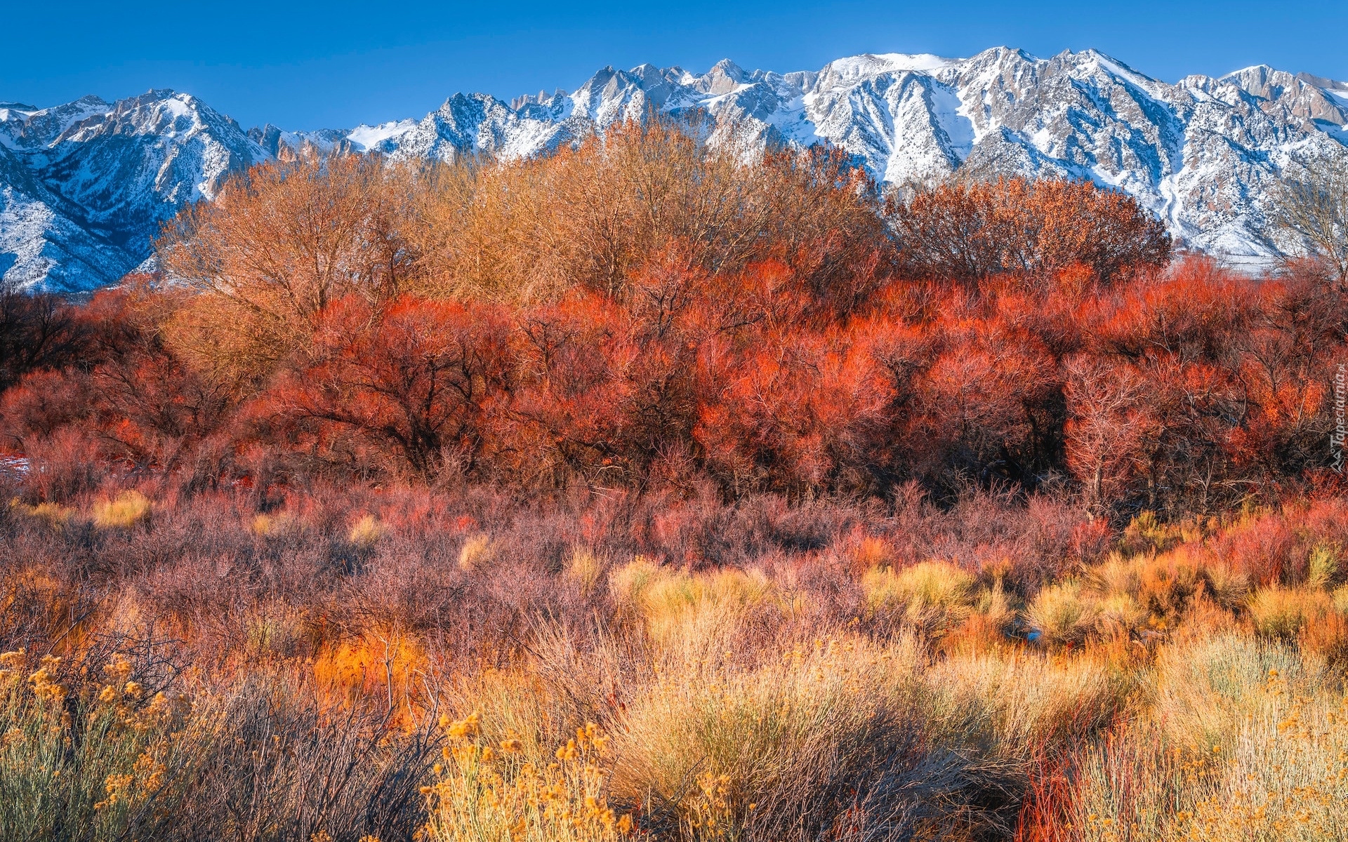 Edytor tapety: Jesienna roślinność na tle gór Alabama Hills