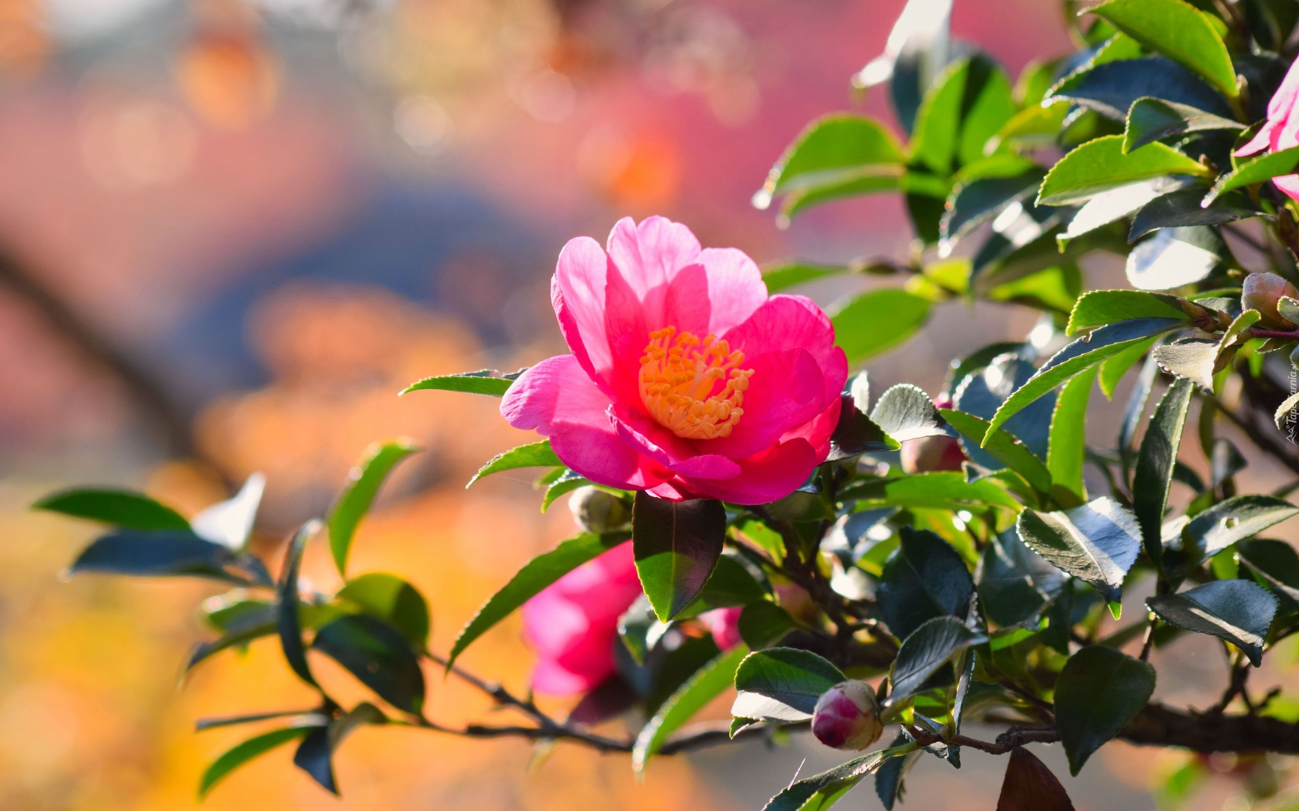 Edytor tapety: Kwiaty i pąki kamelii japońskiej na gałązce