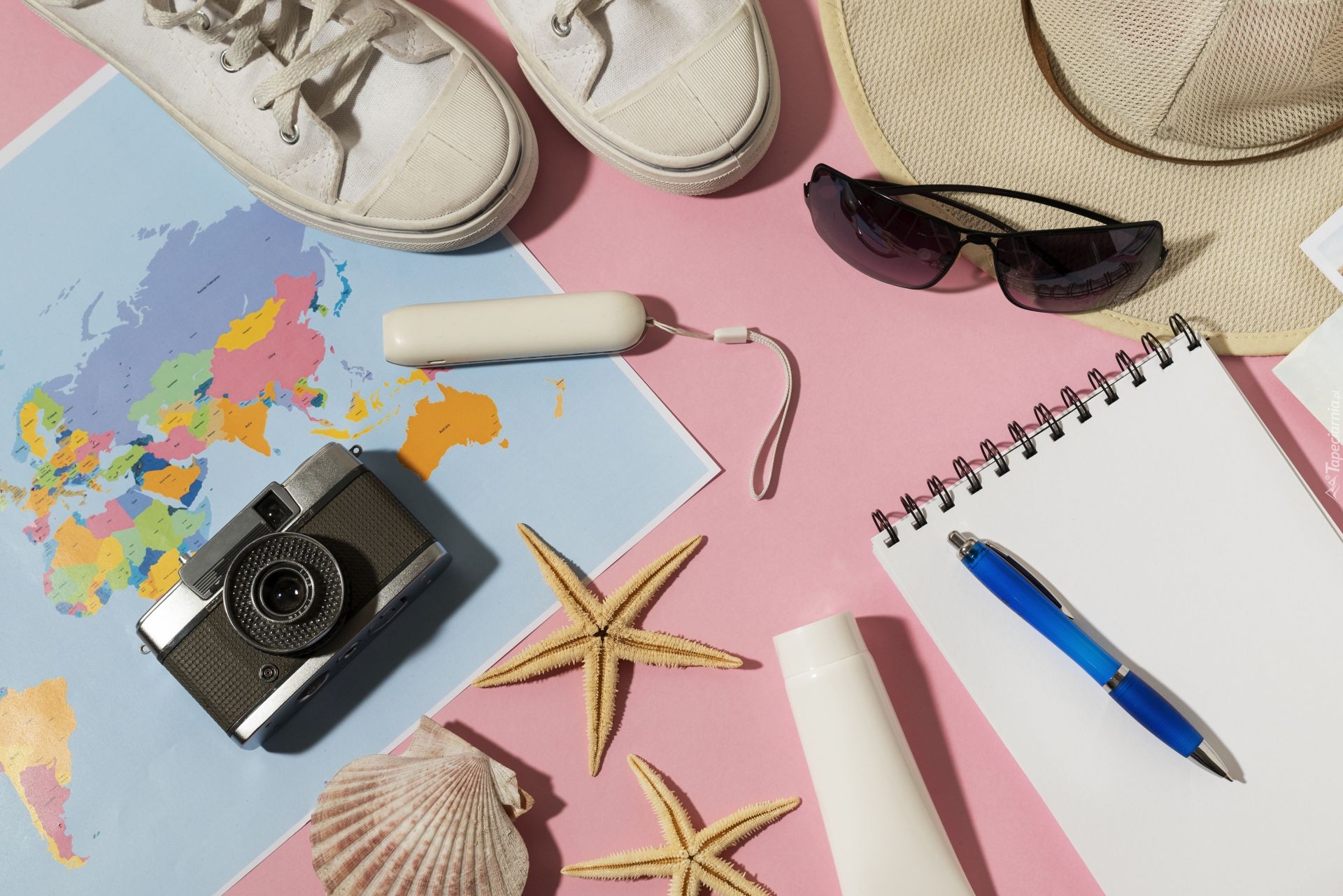Edytor tapety: Aparat na mapie obok tenisówek i notesu