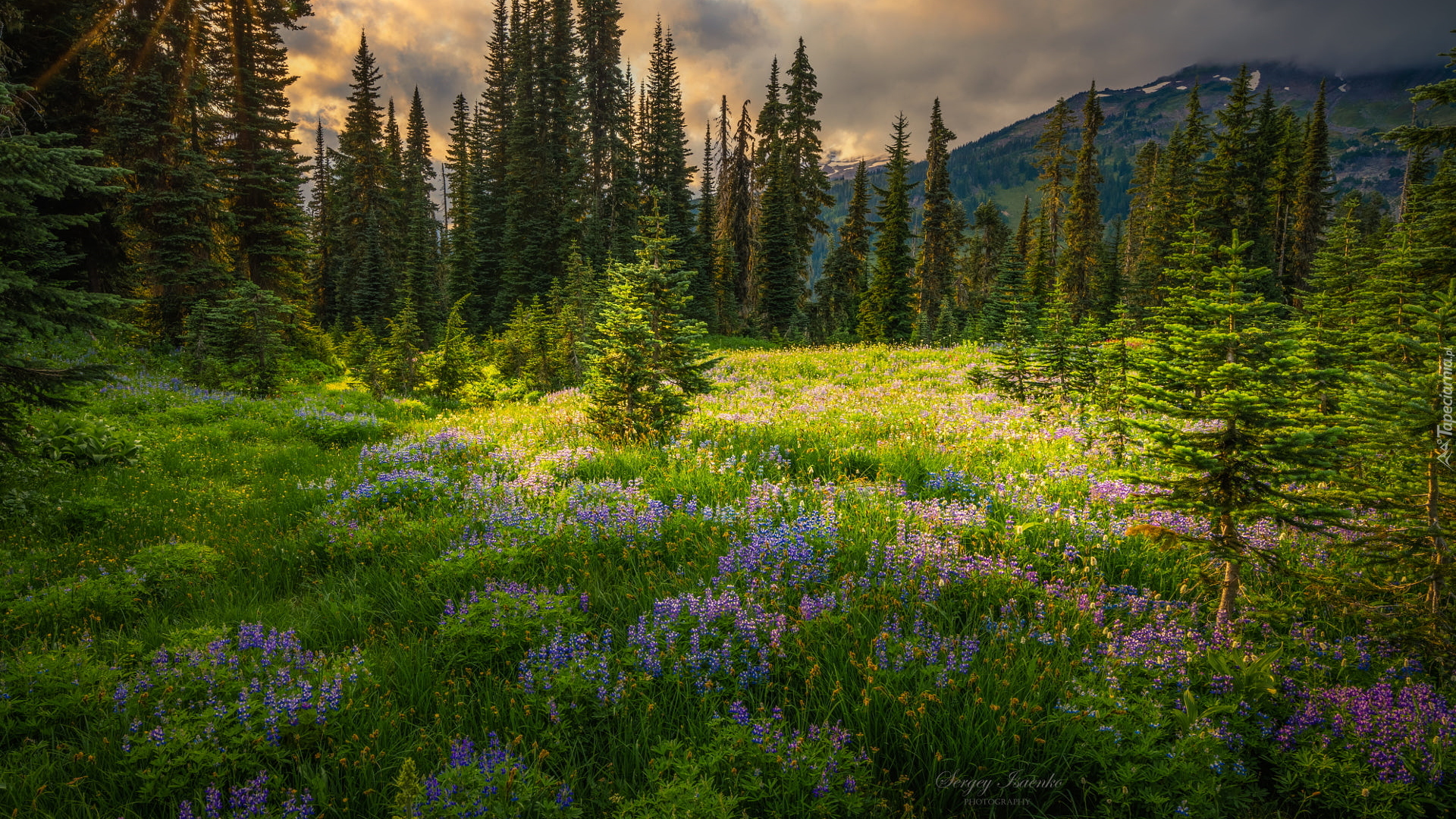 Edytor tapety: Rozświetlona słońcem łąka w Parku Narodowym Mount Rainier