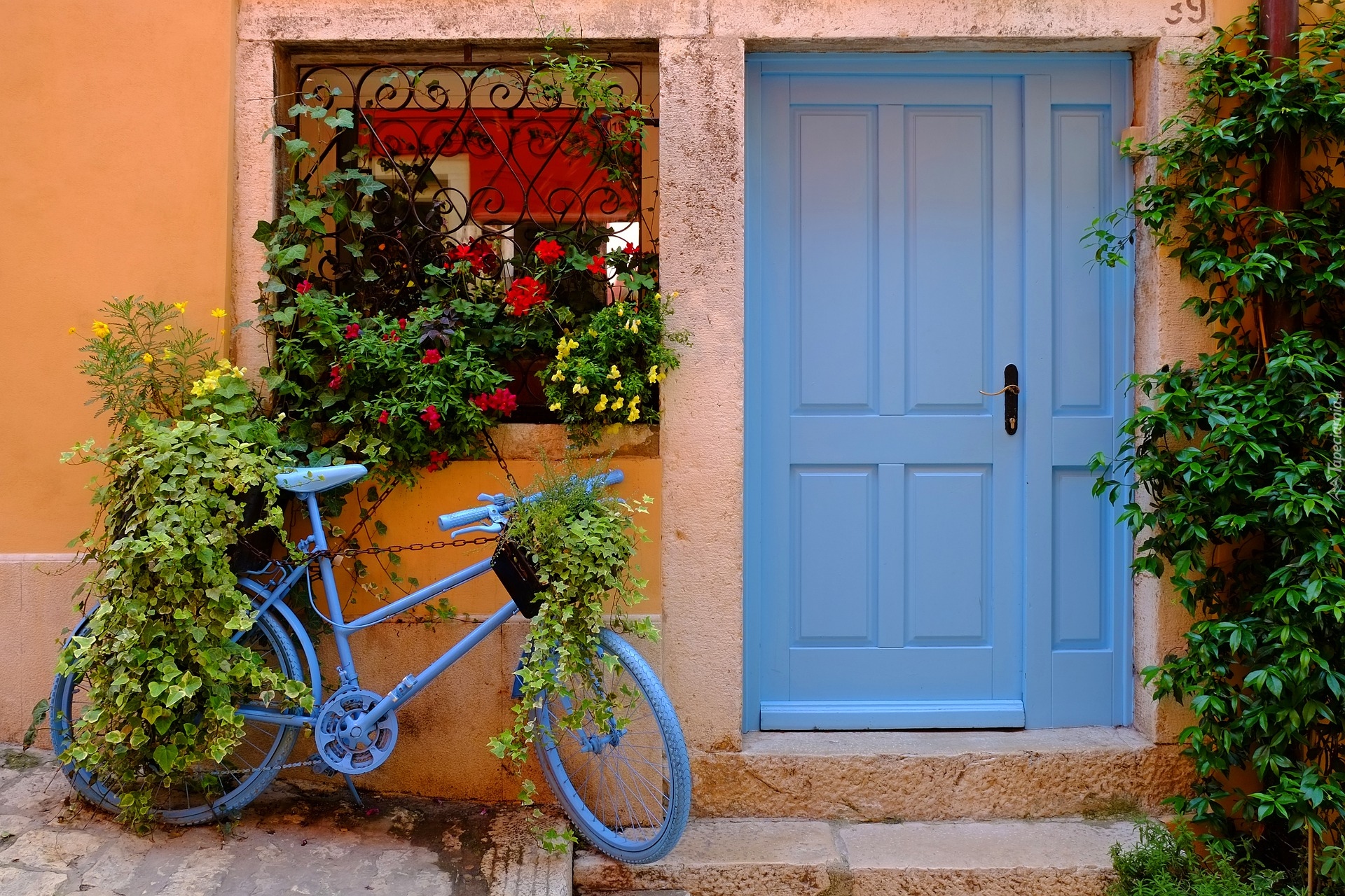 Edytor tapety: Rower z kwiatami pod oknem obok niebieskich drzwi