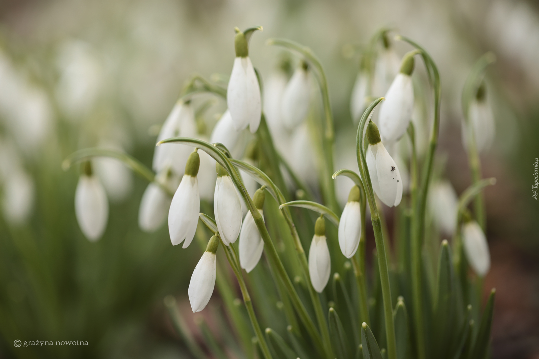 Edytor tapety: Pochylone białe przebiśniegi w zbliżeniu