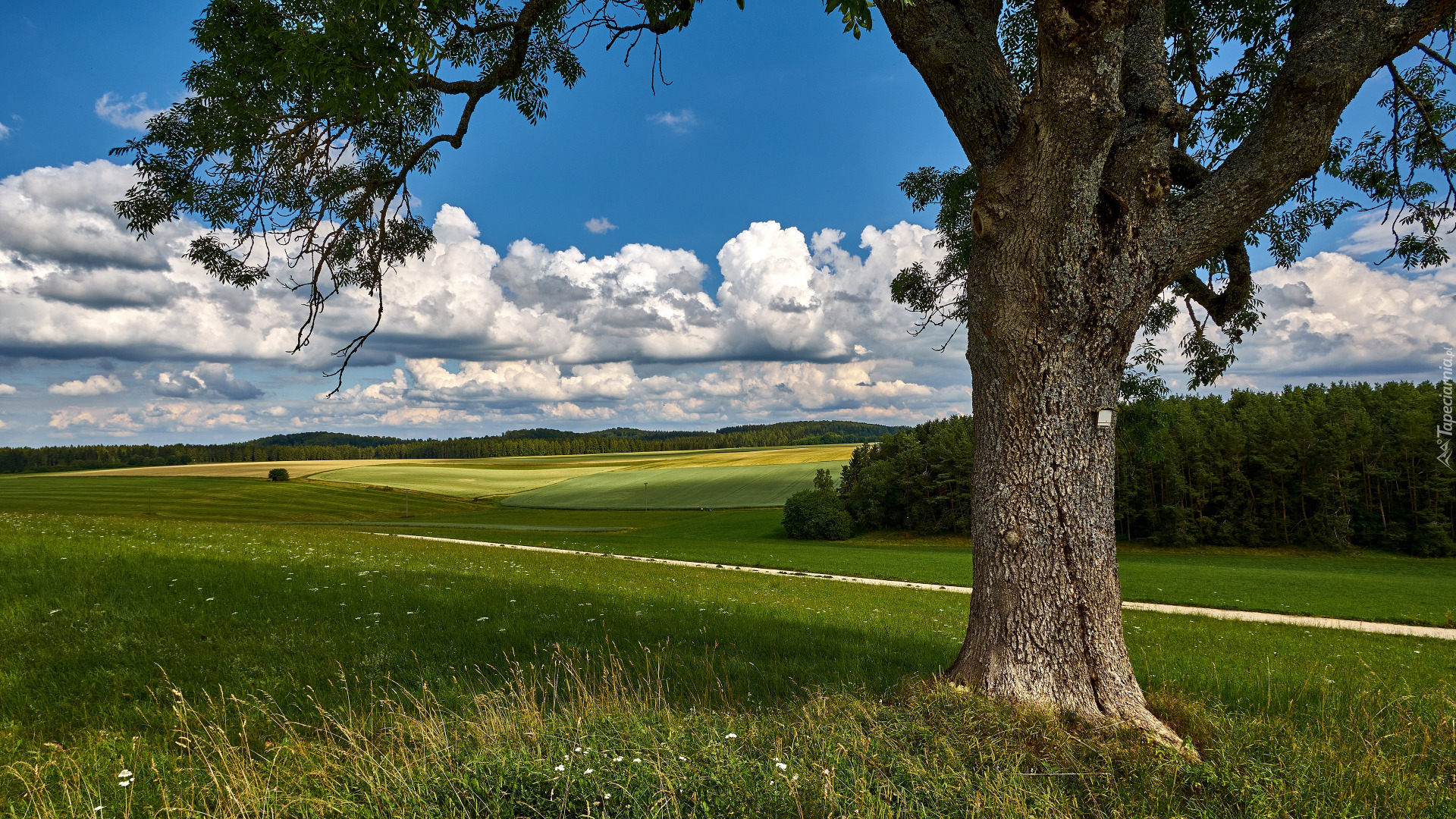 Edytor tapety: Drzewo na łące i chmury nad polem