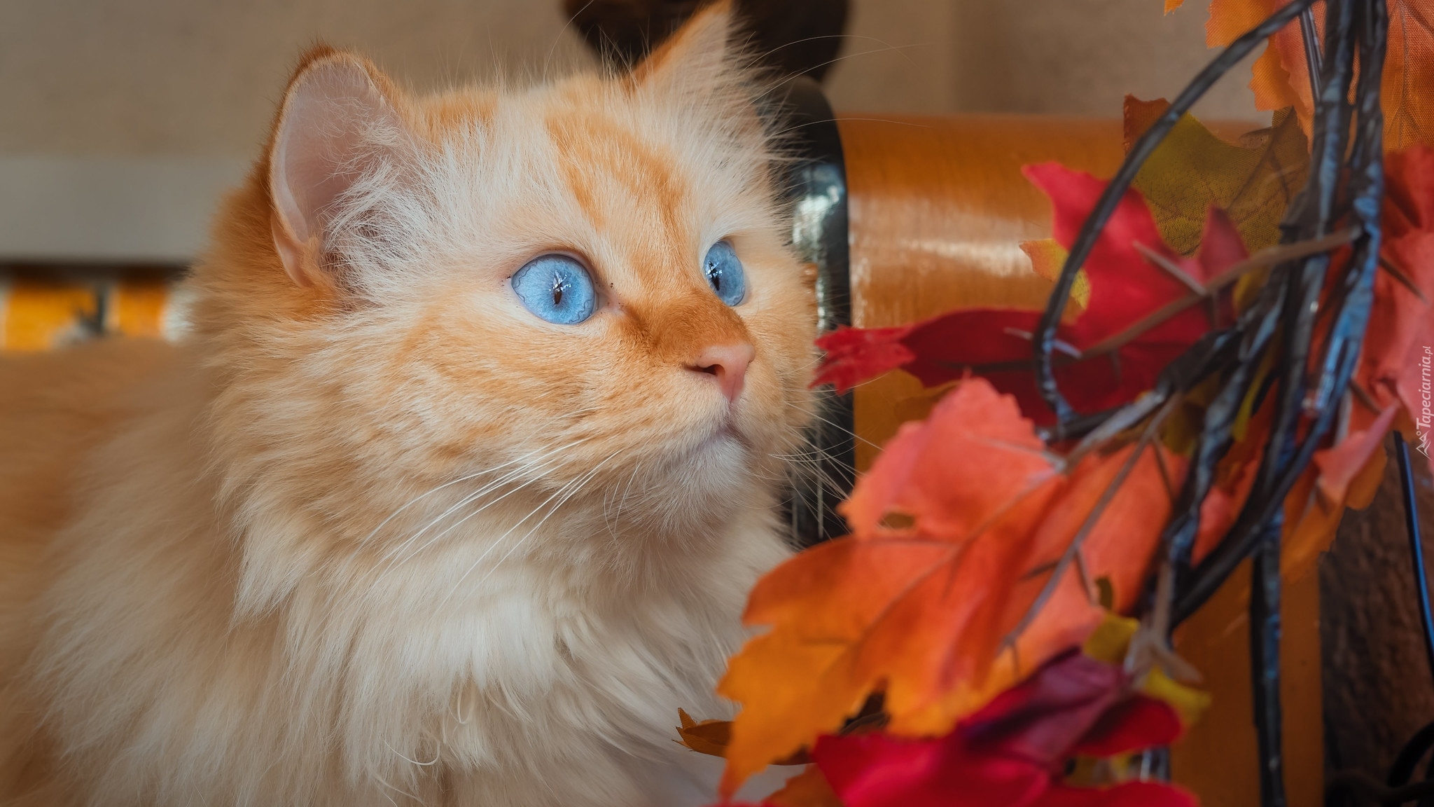 Edytor tapety: Zapatrzony niebieskooki kot obok liści
