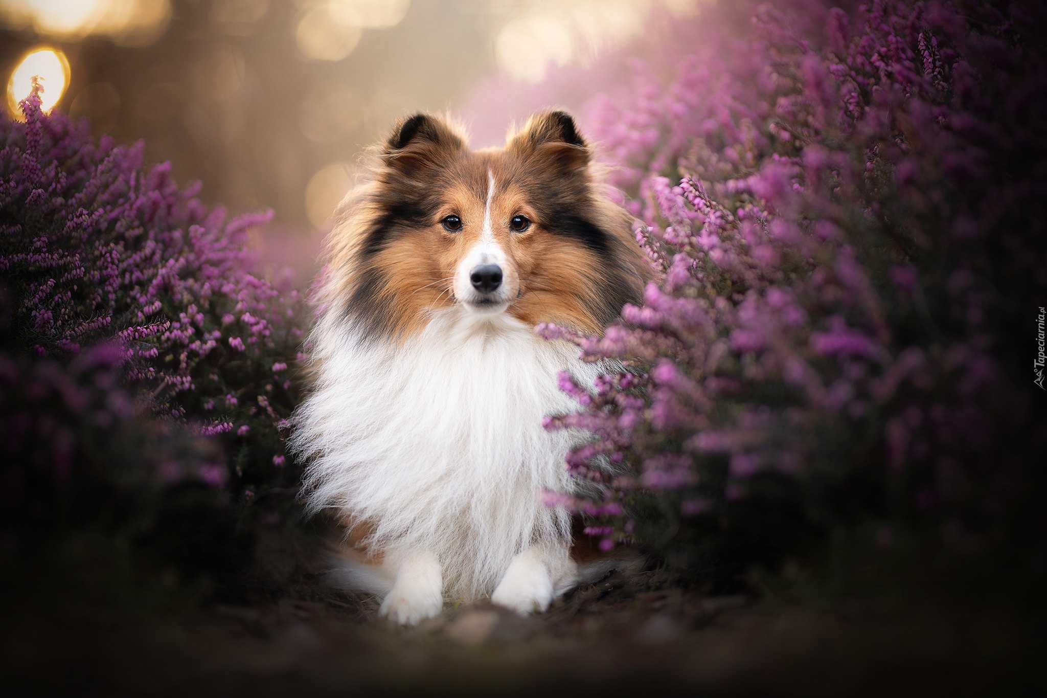 Edytor tapety: Owczarek szetlandzki wśród wrzosów