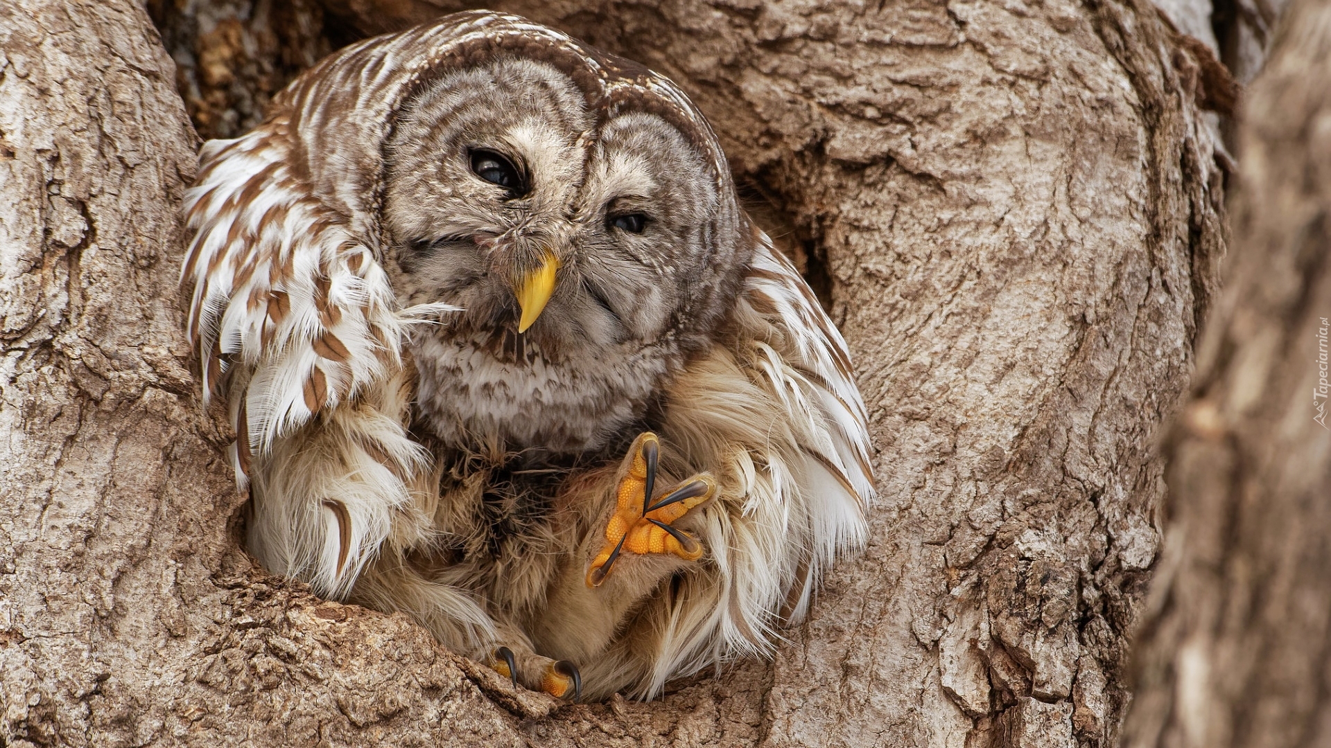 Edytor tapety: Puszczyk kreskowany w dziupli