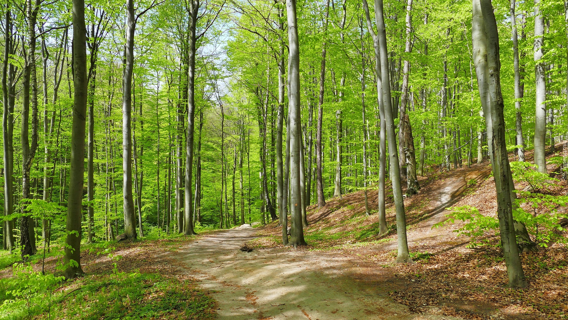 Edytor tapety: Droga w wiosennym słonecznym lesie
