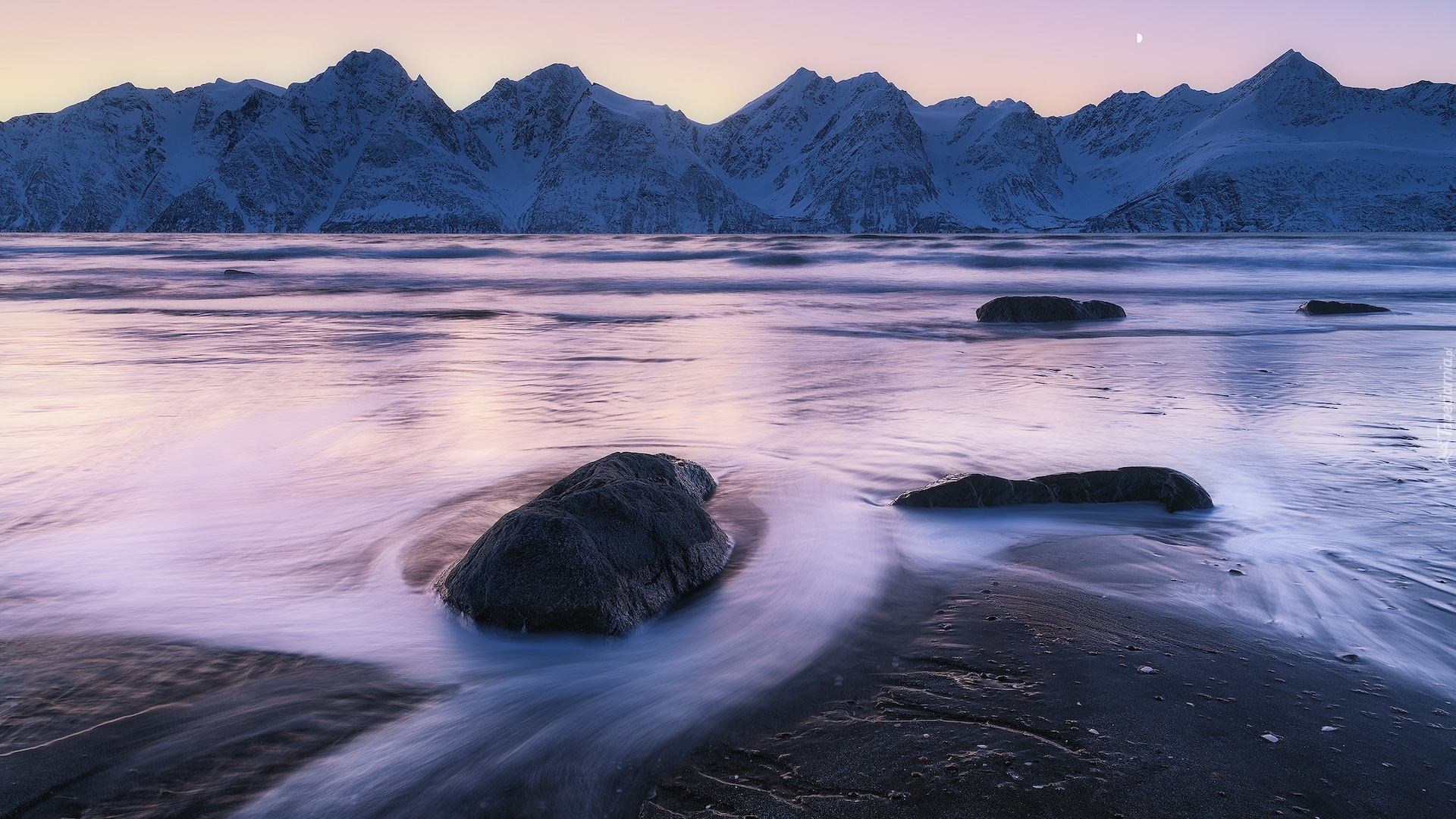Edytor tapety: Widok znad morza na ośnieżone góry