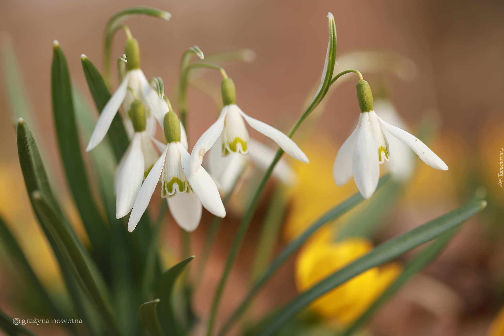 Edytor tapety: Białe rozkwitnięte przebiśniegi na rozmytym tle