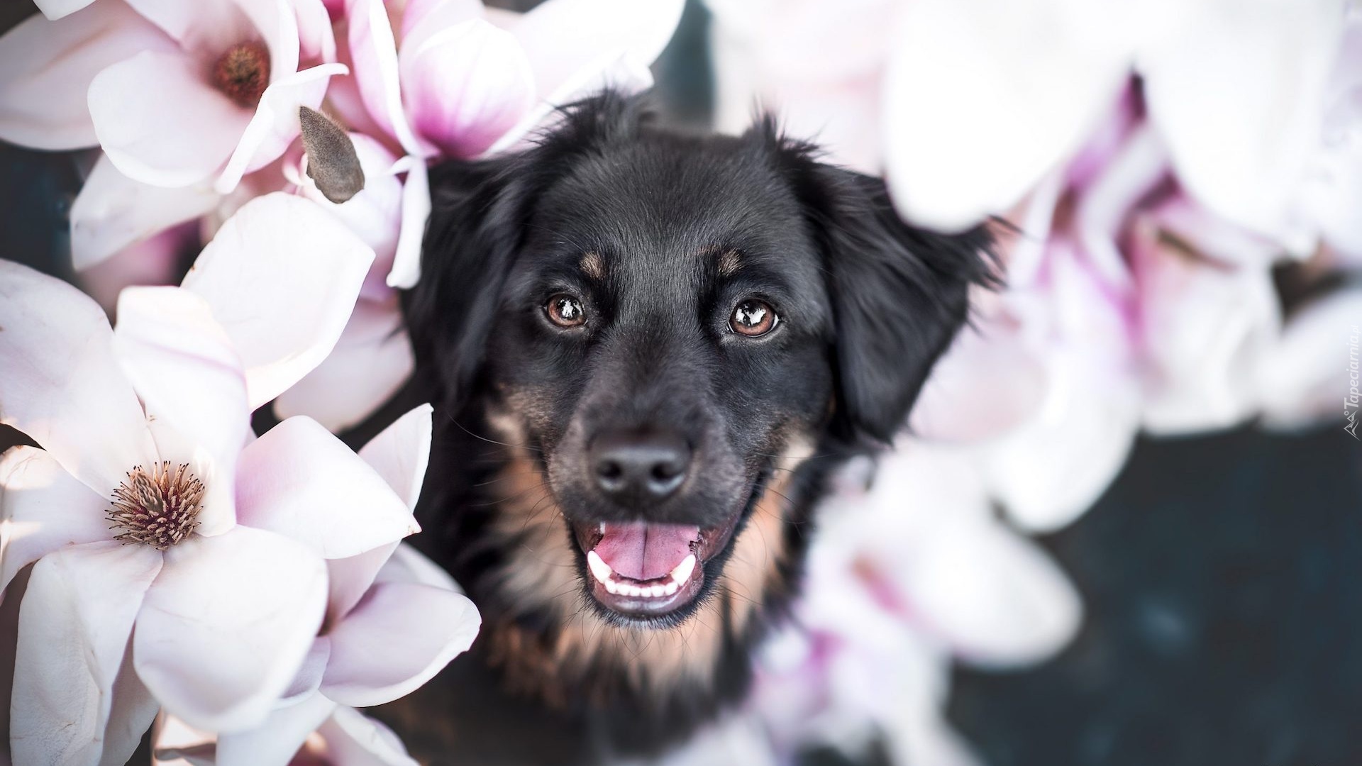 Edytor tapety: Czarny pies w kwiatach magnolii