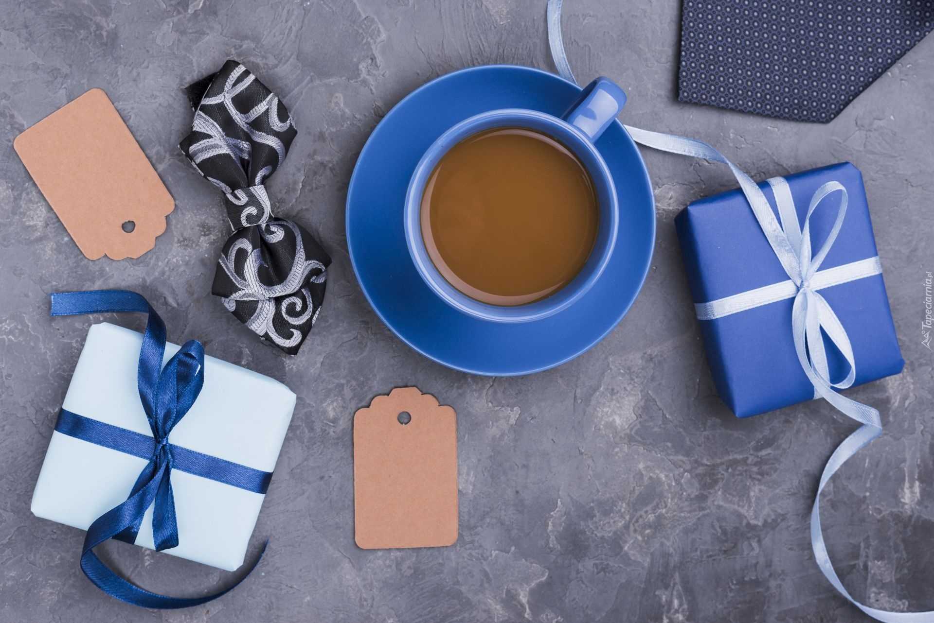 Edytor tapety: Filiżanka kawy obok prezentów na Dzień Ojca