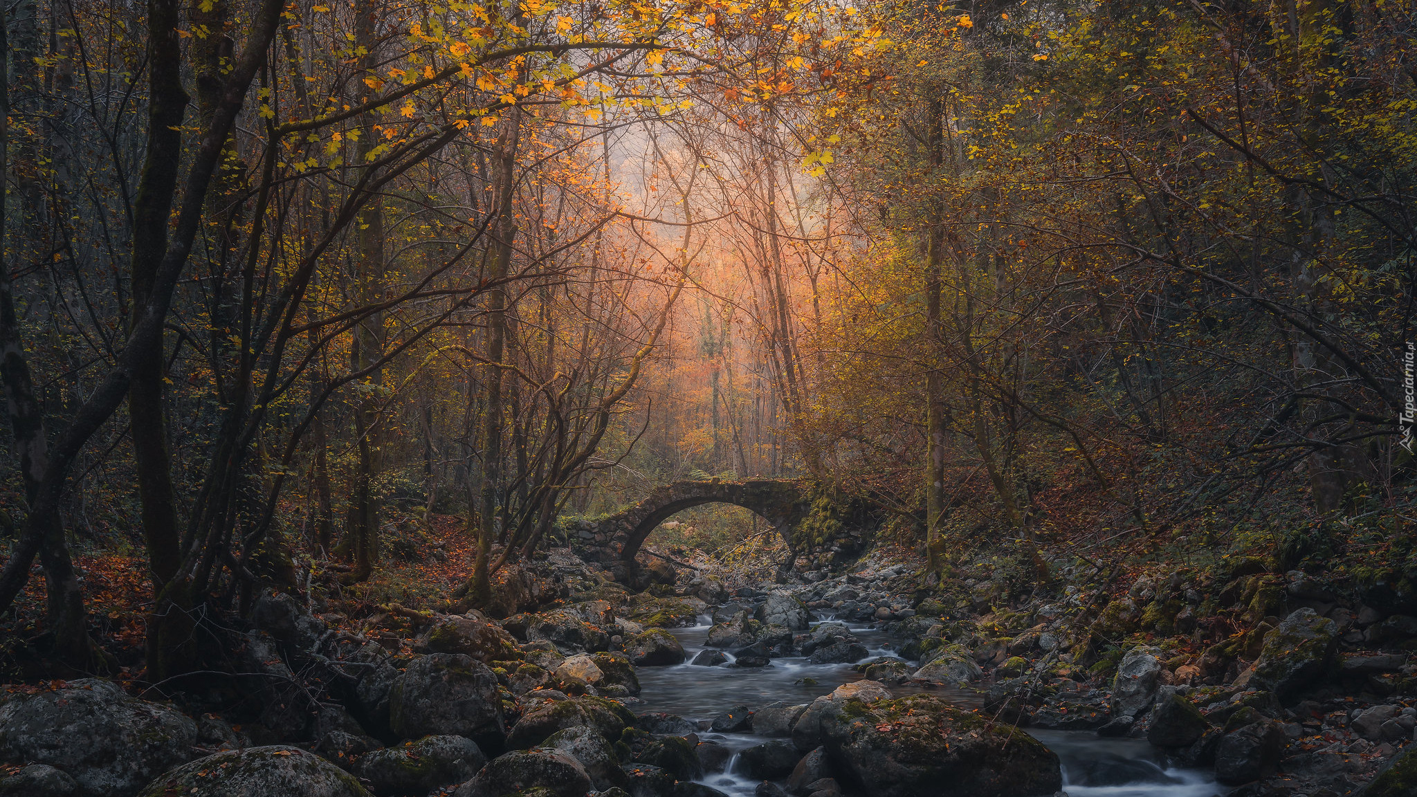 Edytor tapety: Kamienny mostek nad leśną rzeką