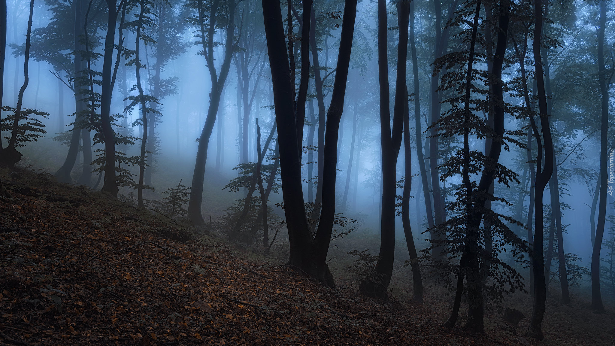 Edytor tapety: Wysokie jesienne drzewa w zamglonym lesie