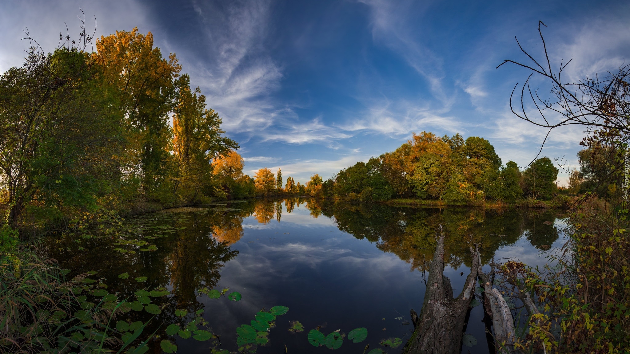 Edytor tapety: Rozświetlone słońcem jesienne drzewa nad jeziorem