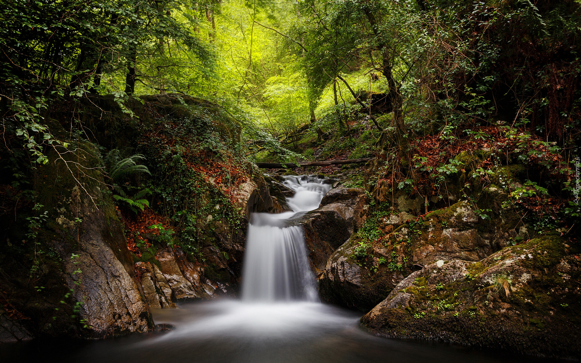 Edytor tapety: Leśny strumień spływający po skałach