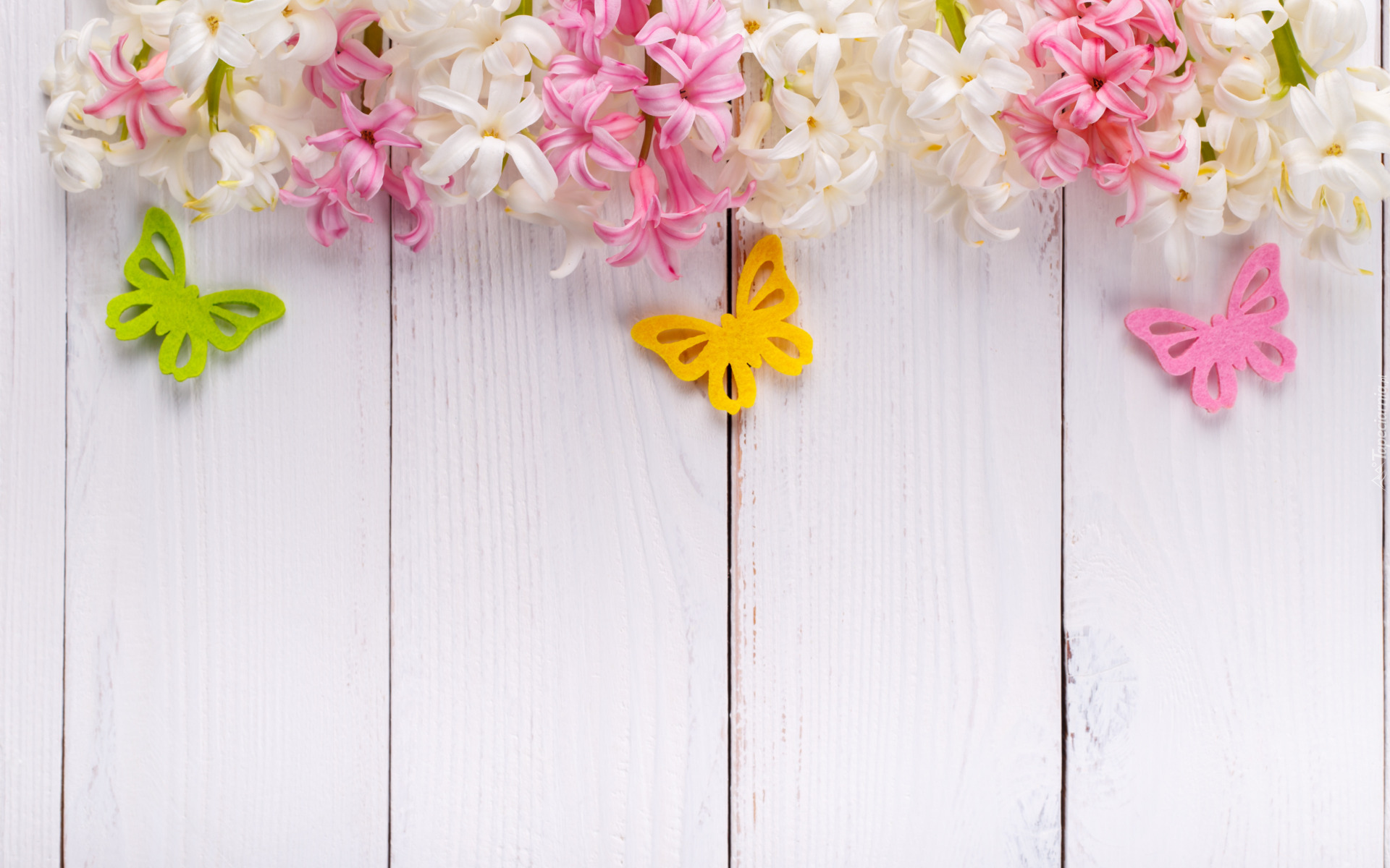 Edytor tapety: Hiacynty i motyle na białych deskach