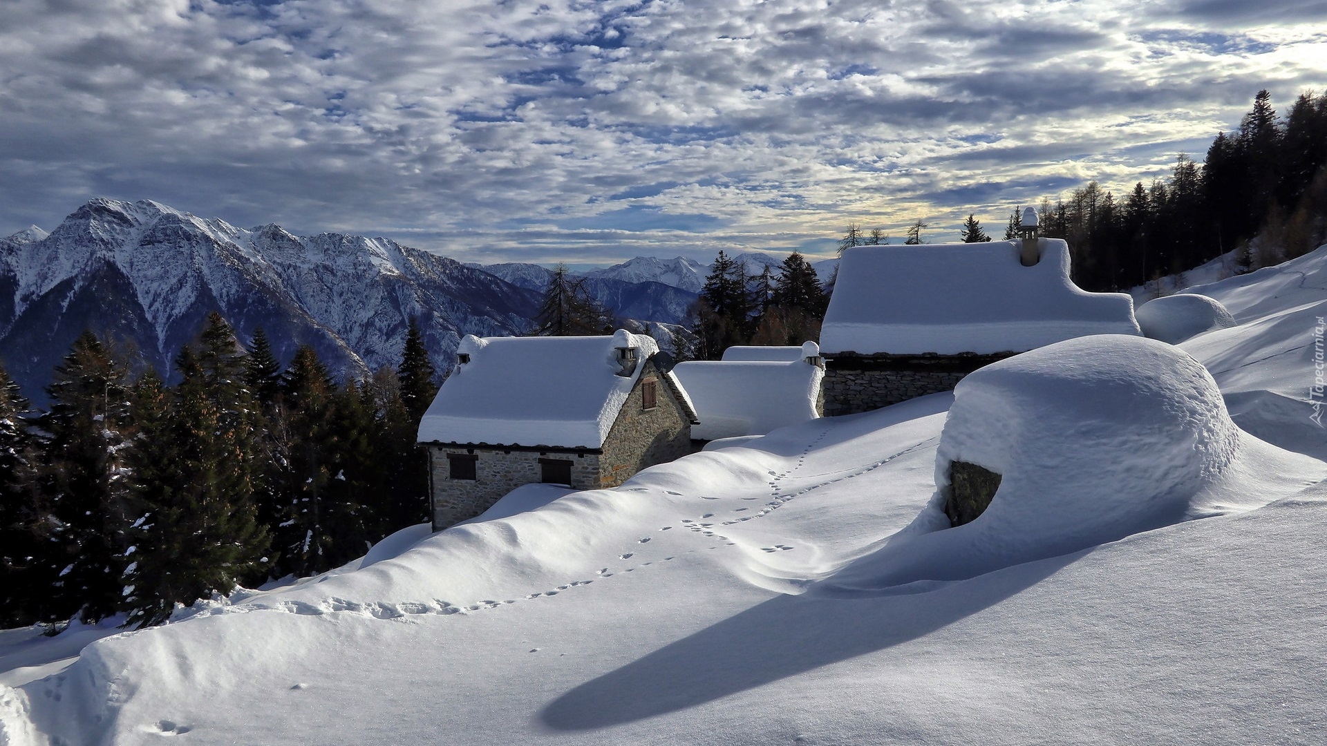 Edytor tapety: Zasypane śniegiem domy na tle gór
