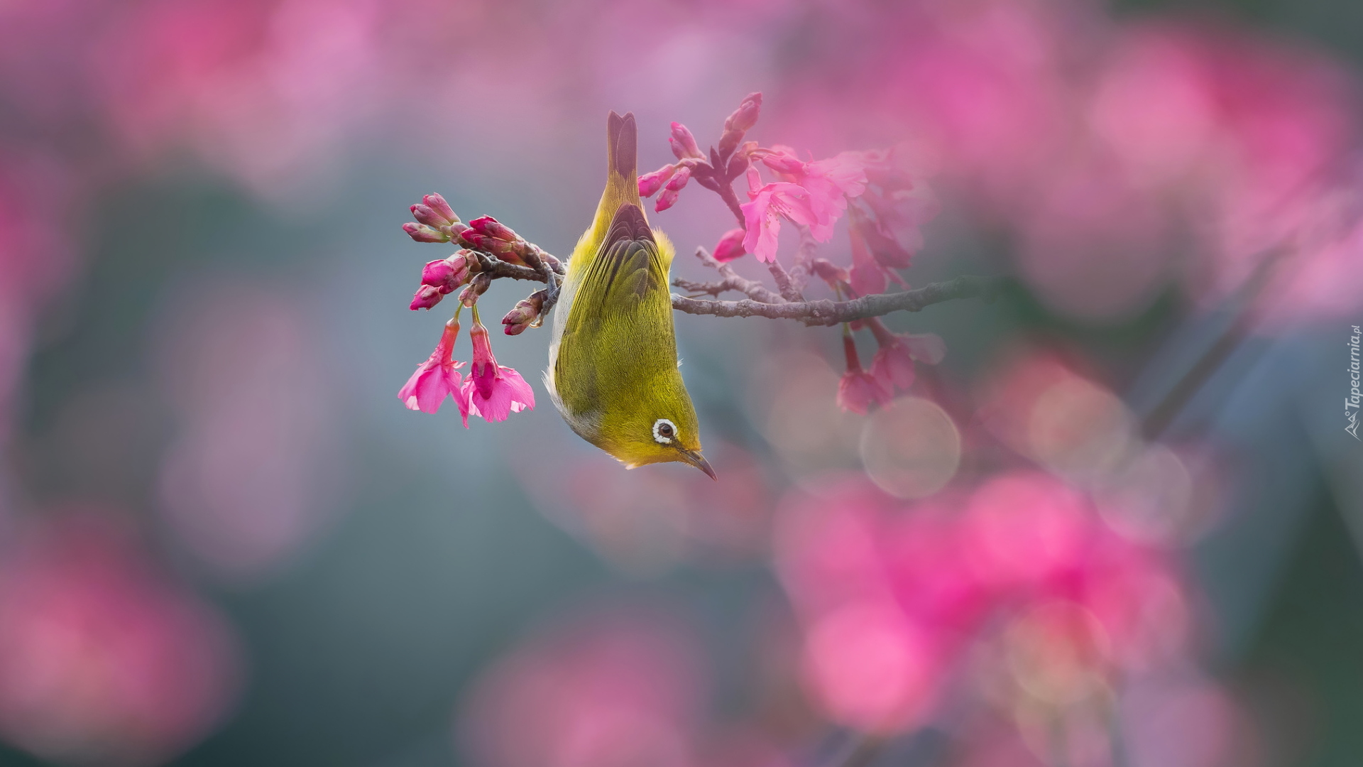 Edytor tapety: Szlarnik japoński na gałązce z kwiatami