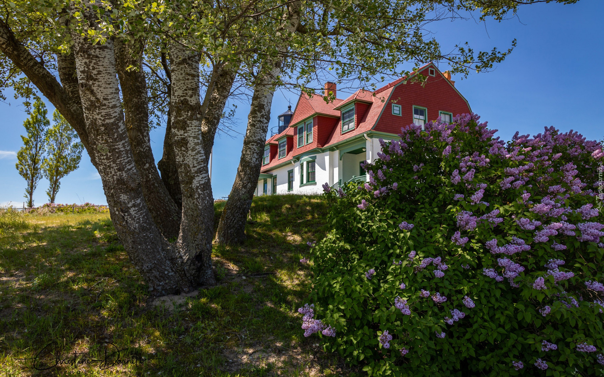 Edytor tapety: Krzew bzu pod drzewem i dom na wzgórzu