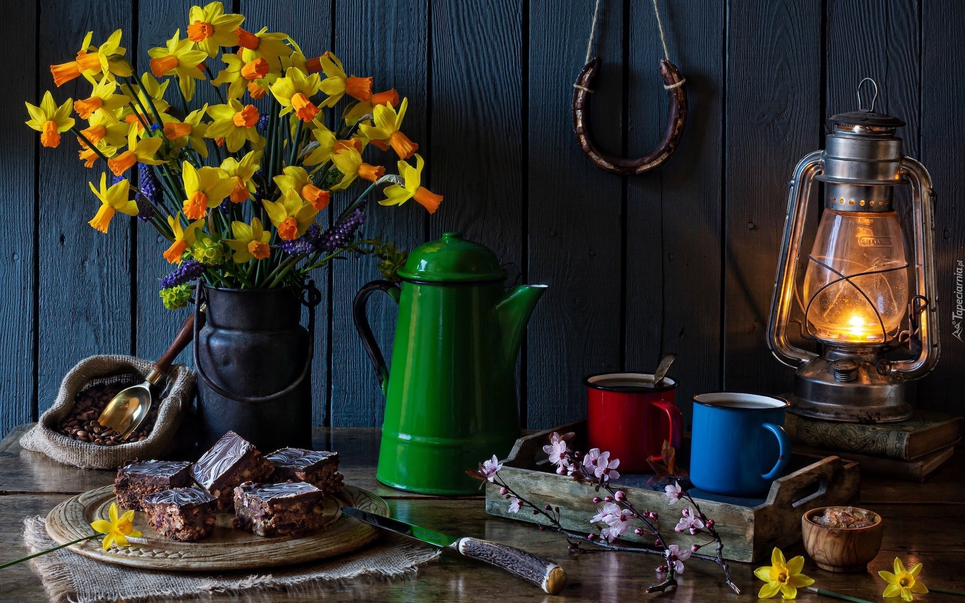 Edytor tapety: Narcyzy żonkile obok dzbanka i lampy