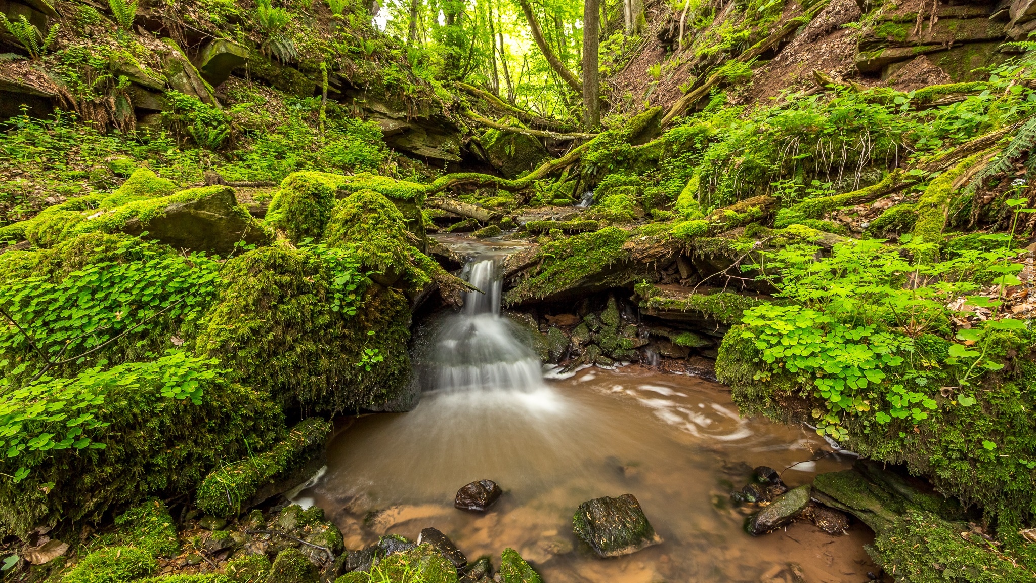 Edytor tapety: Omszałe skały i rośliny przy leśnym strumieniu