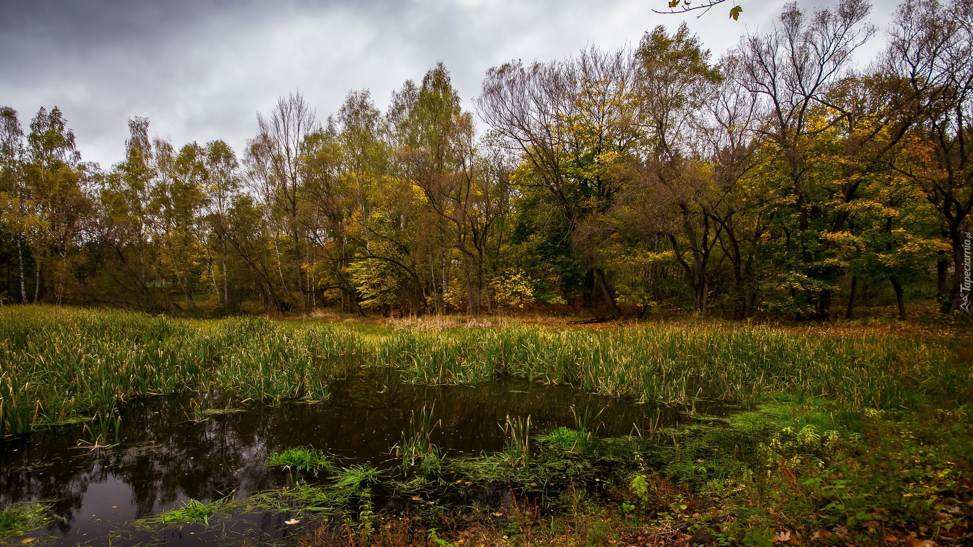 Edytor tapety: Jesienne drzewa i trawy na moczarach